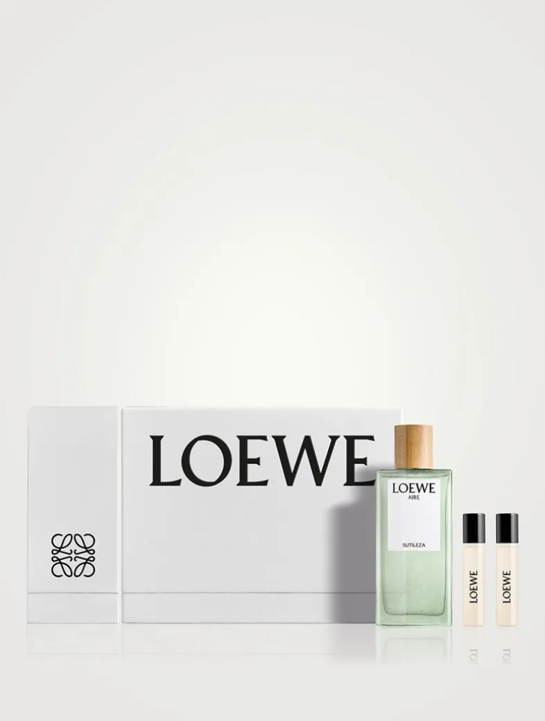 This exclusive Gift Set in monochrome presentation box contains: LOEWE Aire Sutileza EDT 100ml, a LOEWE Aire Sutileza 10ml vial and a LOEWE Aire Anthesis EDP 10ml vial.