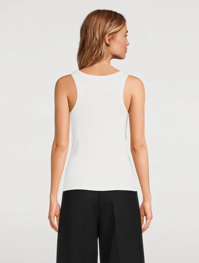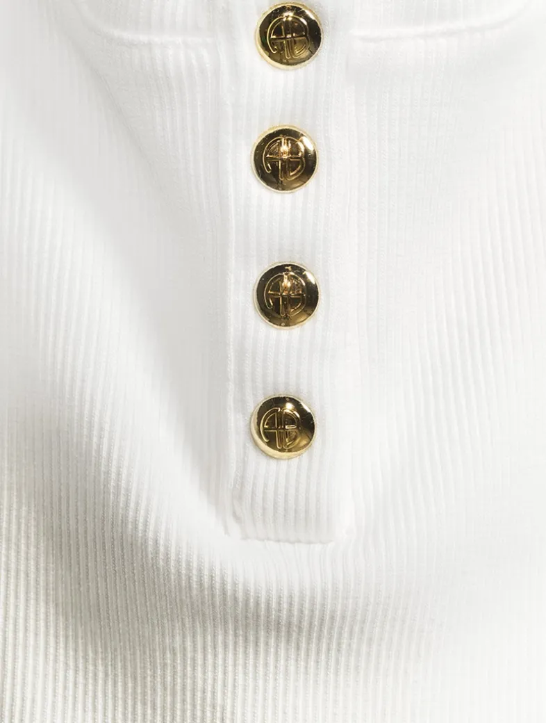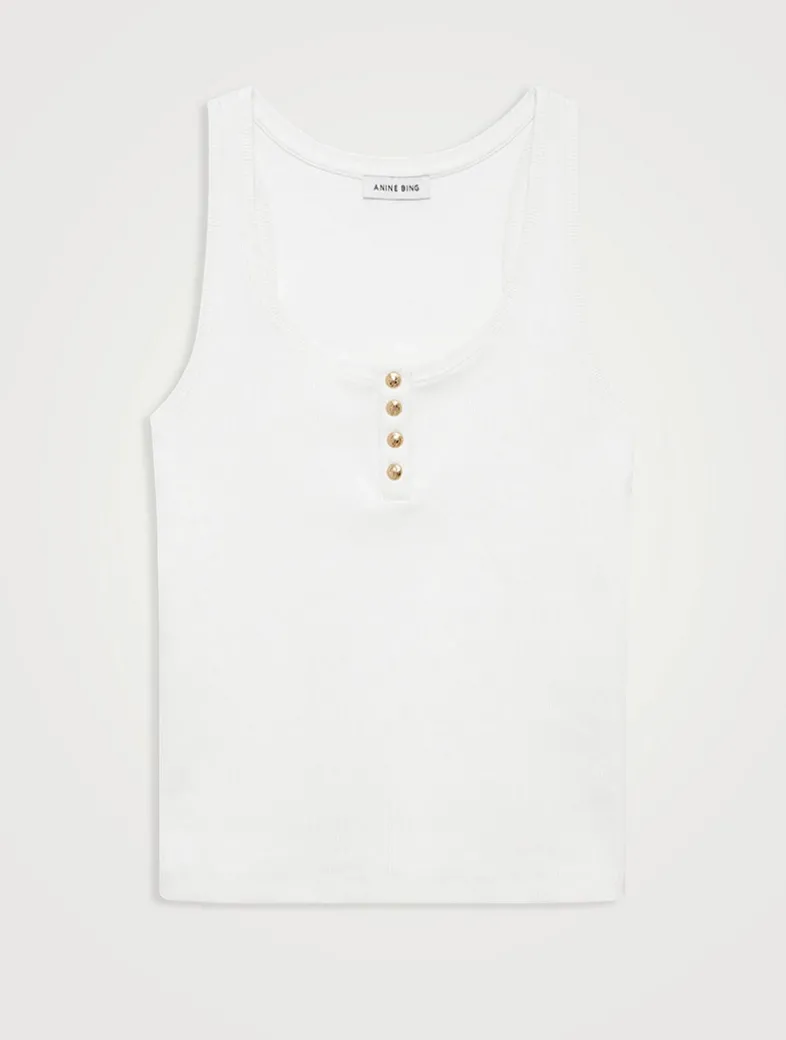 Cut for a relaxed fit, this modern, Henley-inspired tank top is made from a dense cotton-spandex blend with an allover ribbed texture and a soft hand. This elevated basic features a U-shaped neckline and gold monogram snap buttons along the front placket.