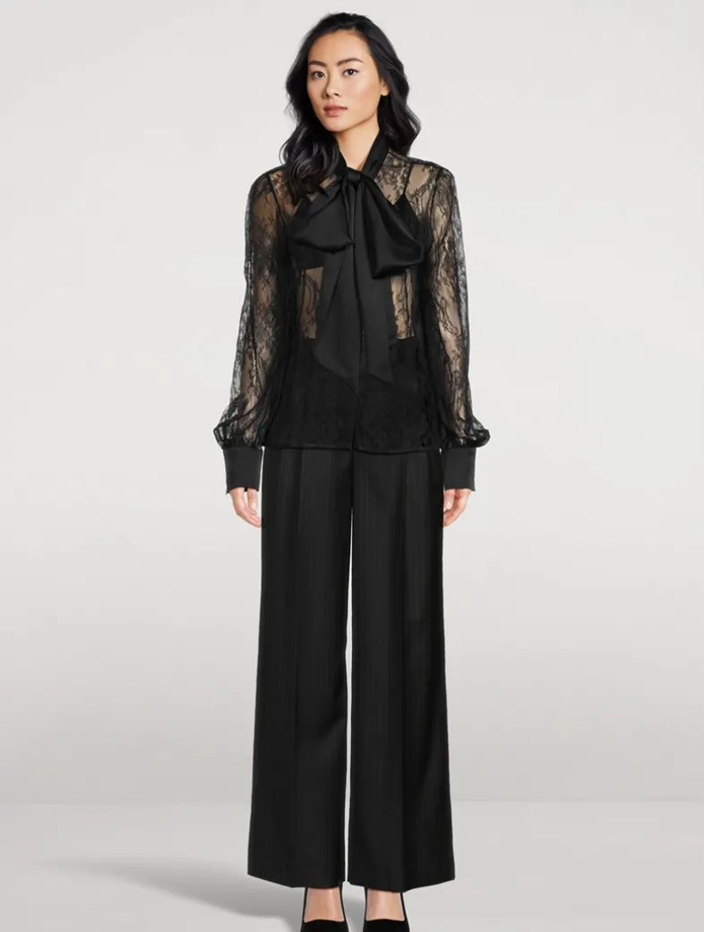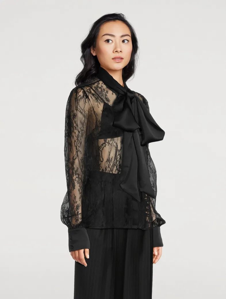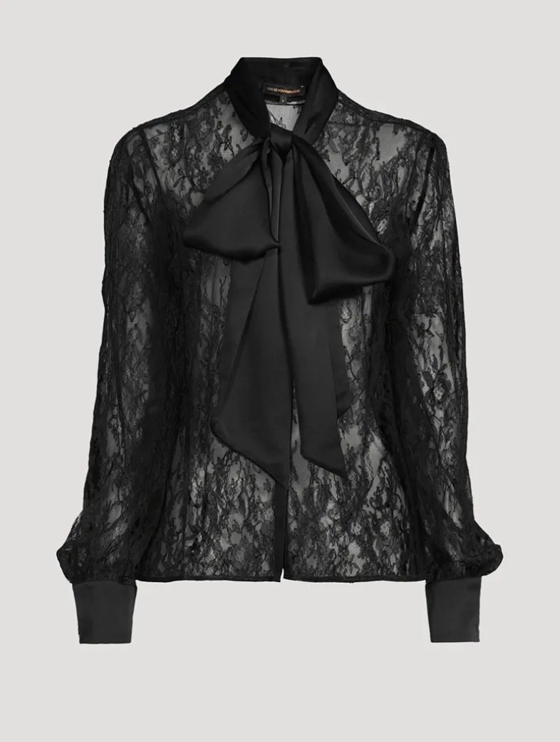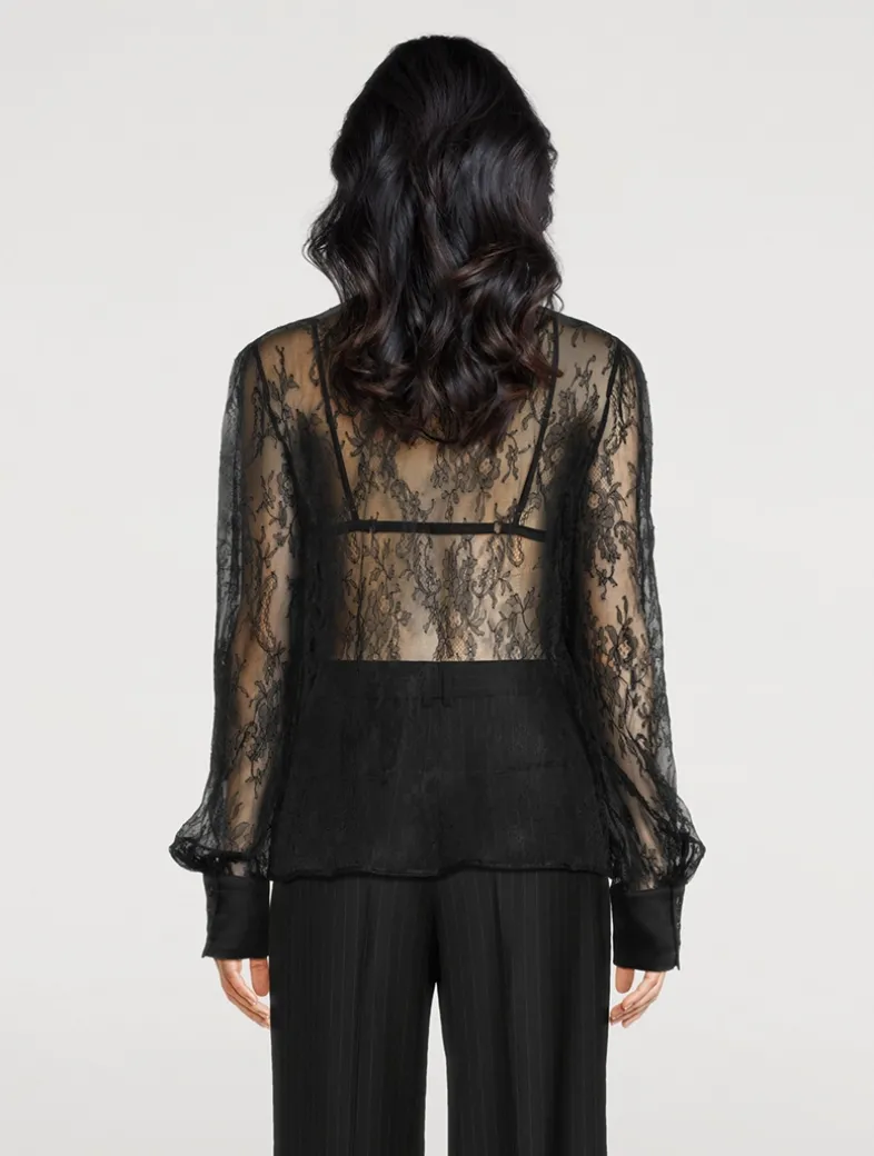 The lines between ready to wear and the boudoir are blurred with this exquisite, semi-sheer blouse. Made from luxe French lace.