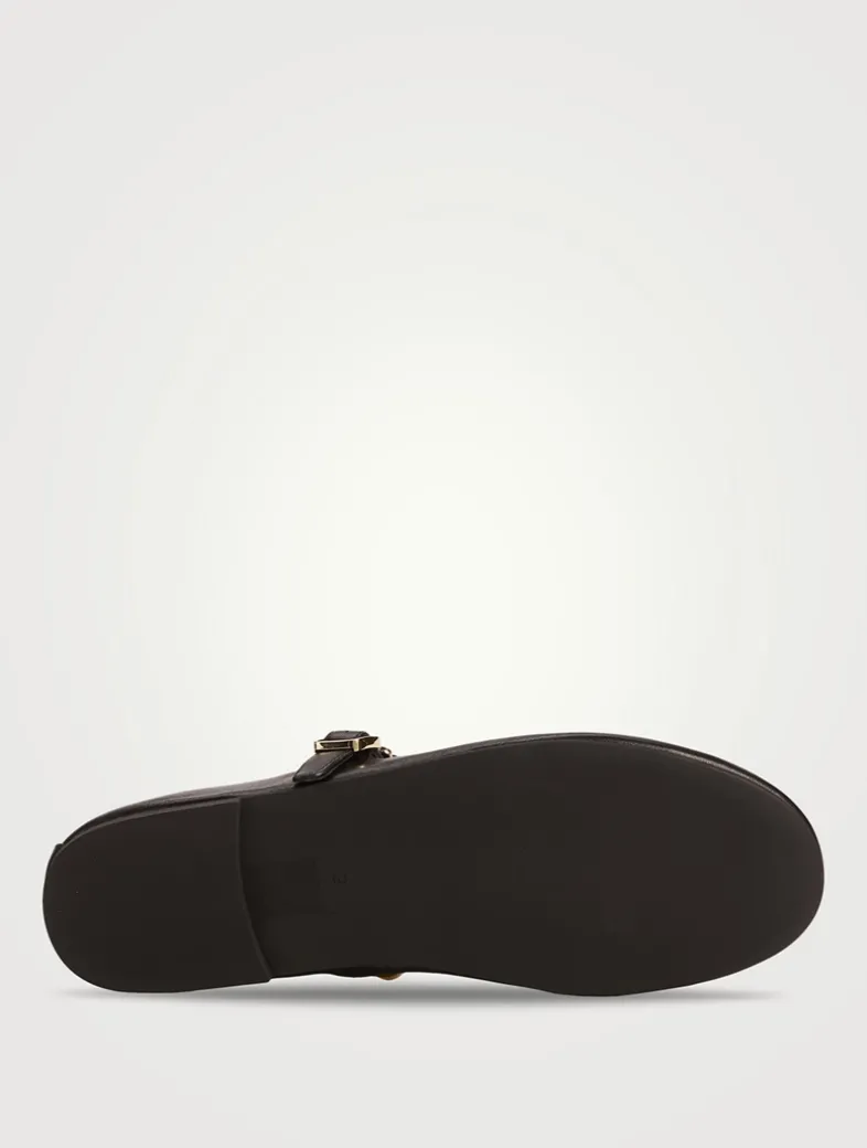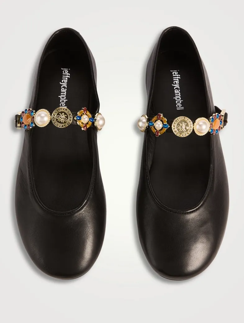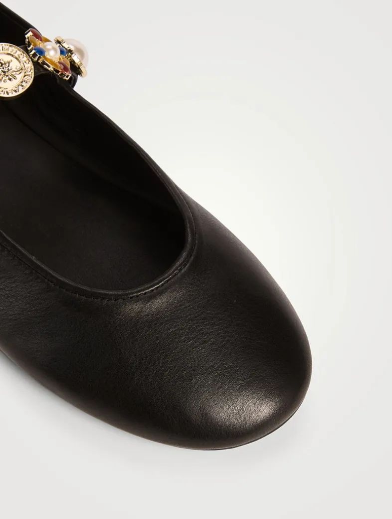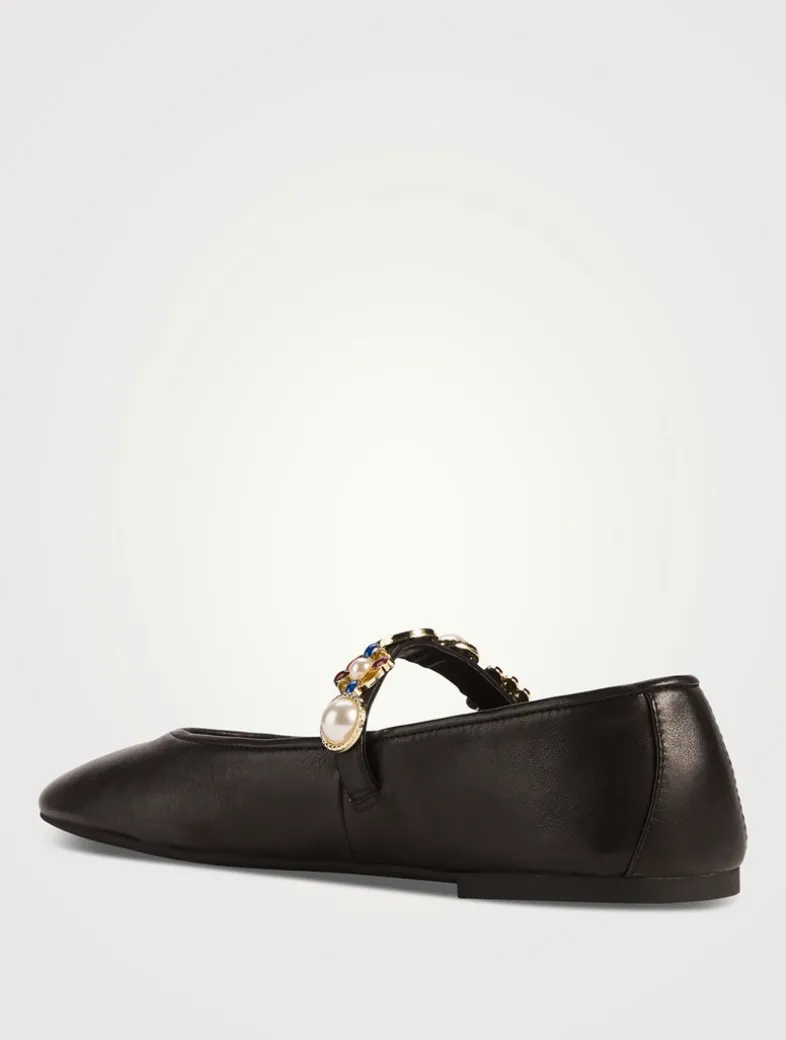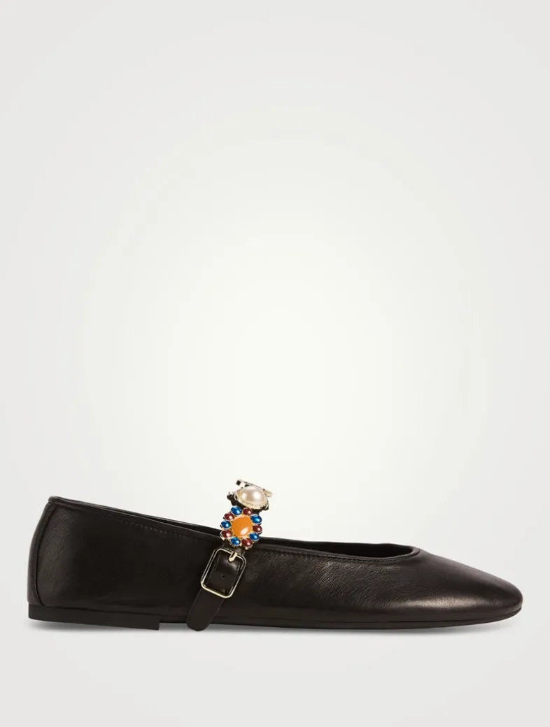 Crafted from a buttery-soft leather, these ballet flats are topped with an adjustable buckled strap embellished with dazzling crystal baubles.