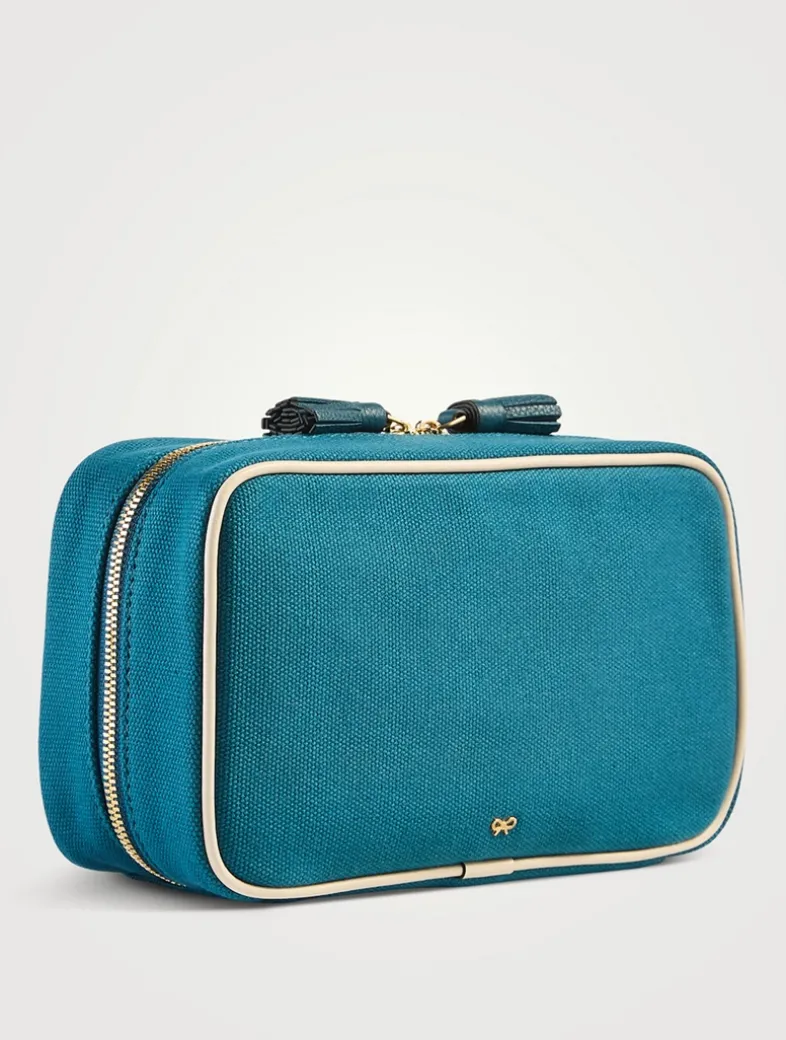 With a design inspired by 1960s air travel, the Amenity Kit will house your essentials. Crafted from recycled canvas with capra leather trims, it unzips via two handmade tassels to reveal a trio of compartments.