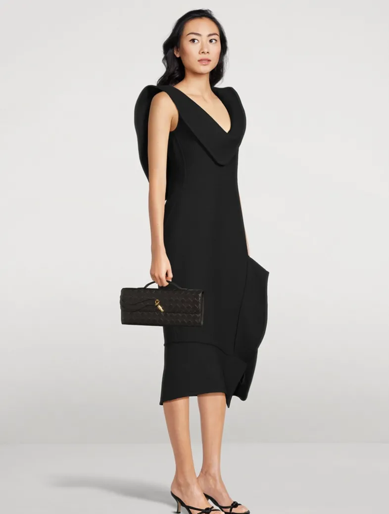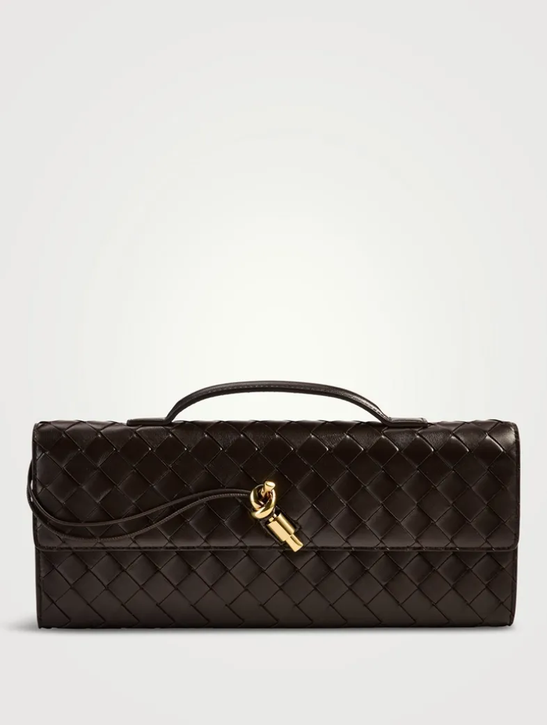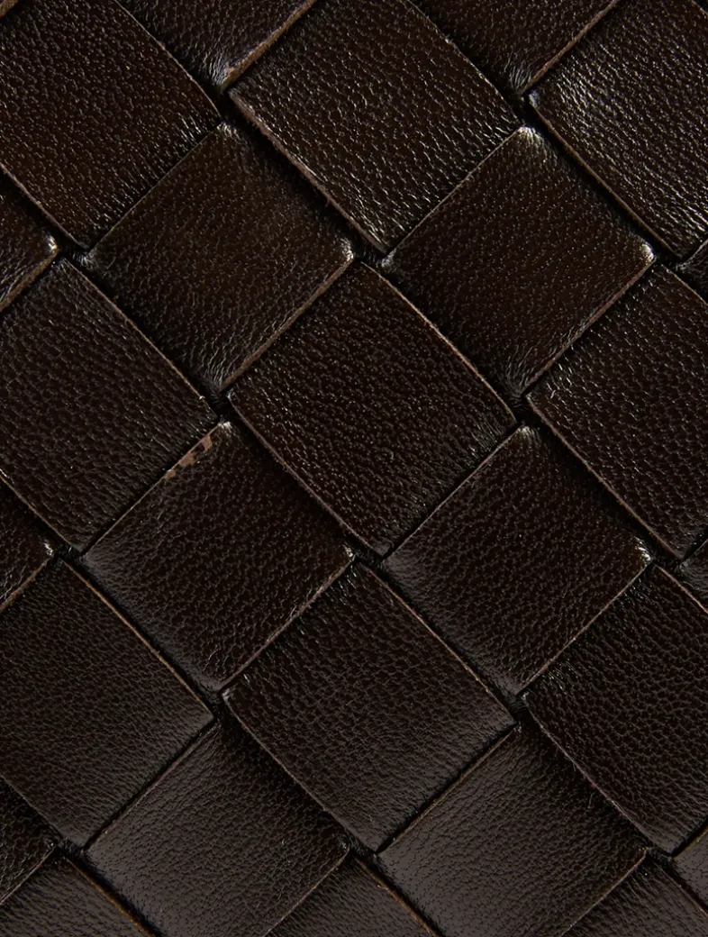 This intrecciato leather bag is designed with a fixed top handle, and its interior has six card slots and a single slip pocket. Bottega’s signature knotted metal hardware adorns the flap.