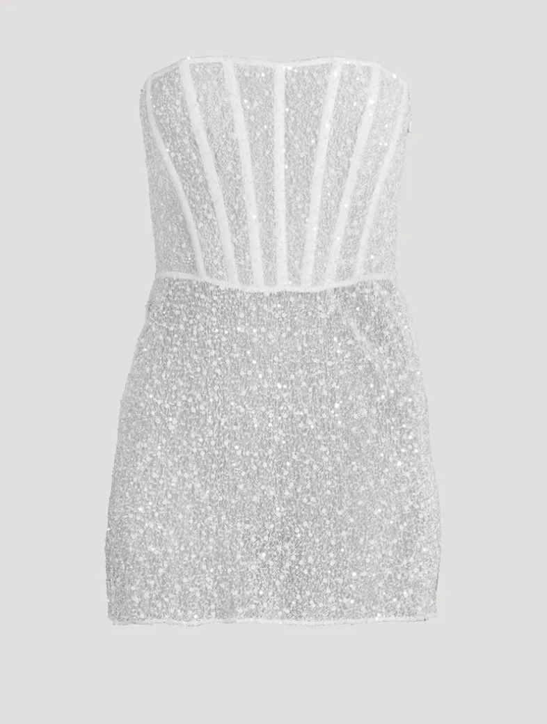 The Ange is a show-stopping mini with a sculpted bodice and boning for structure. The sheer, sparkling beaded fabric adds allure, while the invisible side zipper ensures a seamless fit.