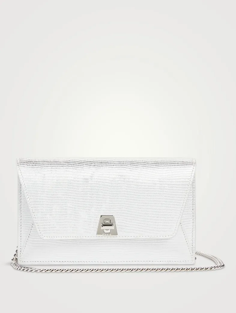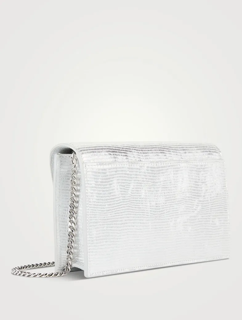 Crafted from lizard-embossed metallic leather, this durable bag will keep you stylish while housing all your essentials. A detachable crossbody chain enables you to wear it as a crossbody, as a clutch, or as a shoulder bag (the chain adjusts to a short double handle), giving you three different looks. Features an interior clamp pocket and six credit card slots.