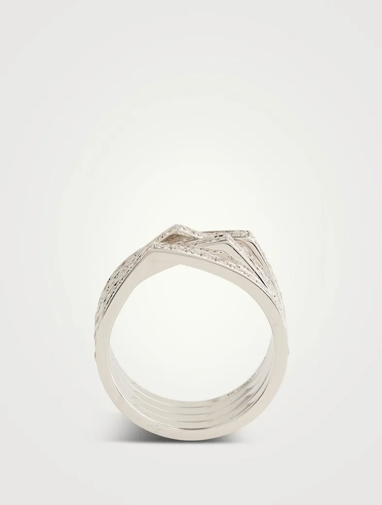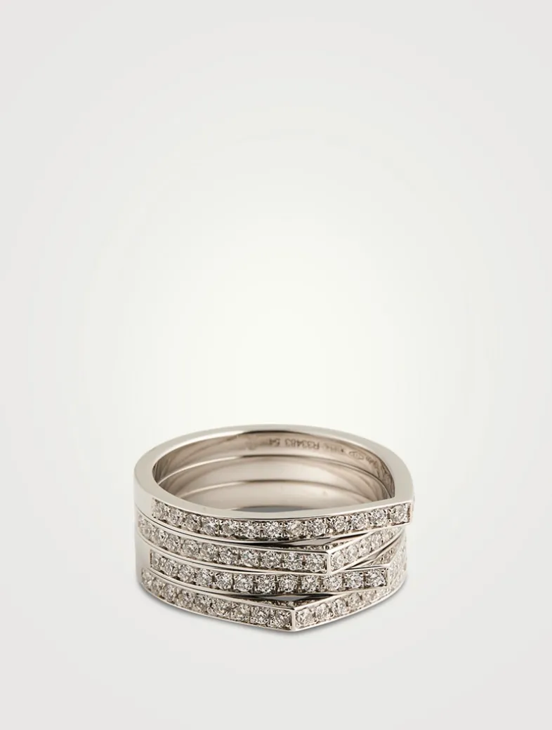 Antifer refers to a simple line forming a strong peak, architecturally stacked in an asymmetrical rhythm to suggest a cliff. Made in Italy, this stunning four-row ring features stacked peaks and sparkling paved diamonds.