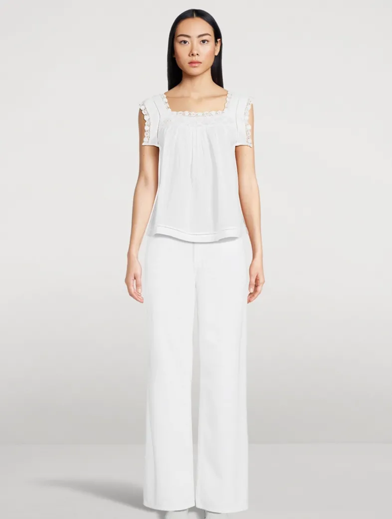 Delicate floral embroidery highlights this sleeveless blouse. Crafted from a lightweight ramie, it is cut to a relaxed silhouette with a square neckline.