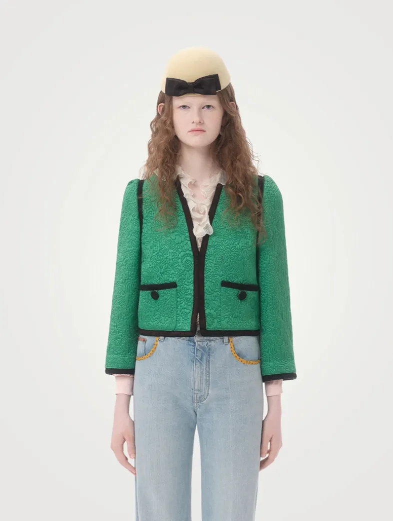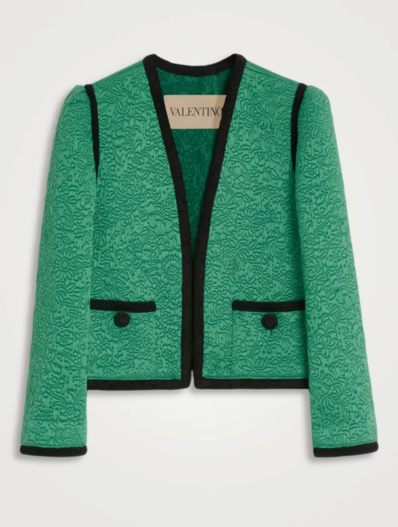 Highlighted with contrasting edges, this wool and silk topper is detailed with Valentino’s Après L’Hiver floral matelassé texture. It is cut to a boxy silhouette and finished with soutache buttons on the pockets.