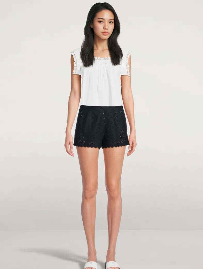 Made from soft, lightweight organic cotton and rendered in an allover embroidered eyelet design, the Arbre Short features an A-line cut, an ultra-high waist with an invisible side zipper and hook-and-eye closure, allover eyelet detailing, and scallop eyelet trim at the hem.