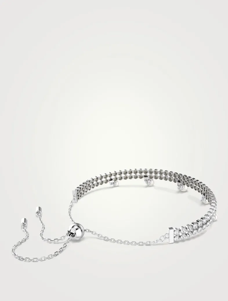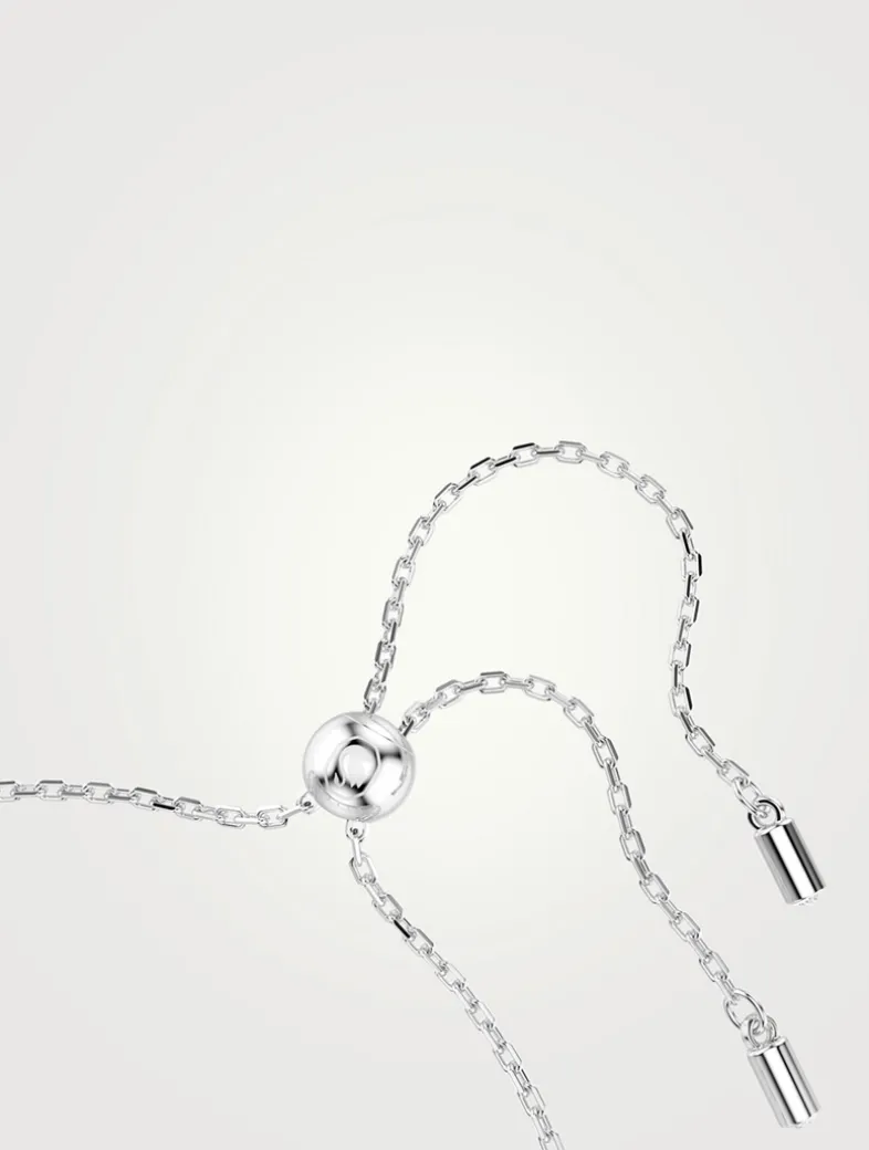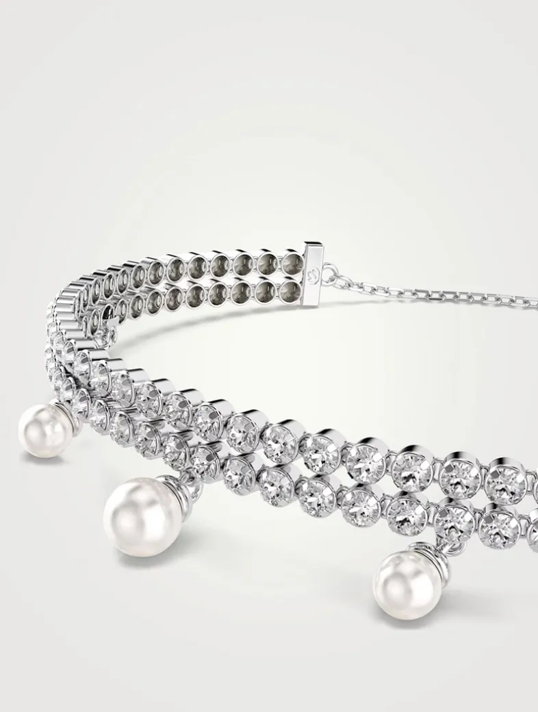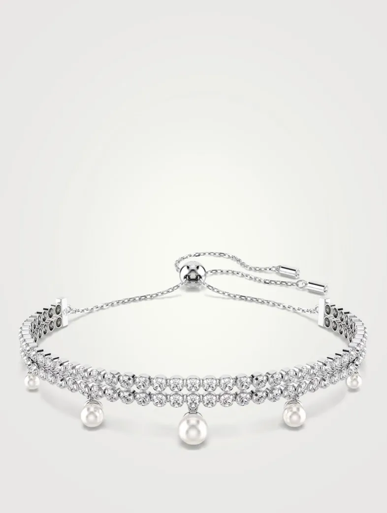 Co-created with Ariana Grande and Swarovski Global Creative Director Giovanna Engelbert, this capsule collection celebrates the love of music and the art of timeless style, combining spellbinding savoir-faire with contemporary cool. Easily adjustable with a sliding ball closure, this rhodium-plated design features two rows of cupchain, set with clear Swarovski Zirconia in round cuts and an adornment of Swarovski Crystal Pearls below.