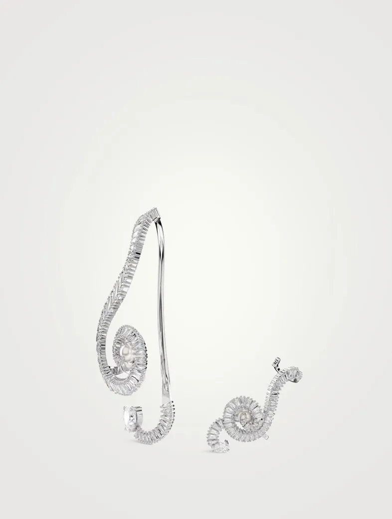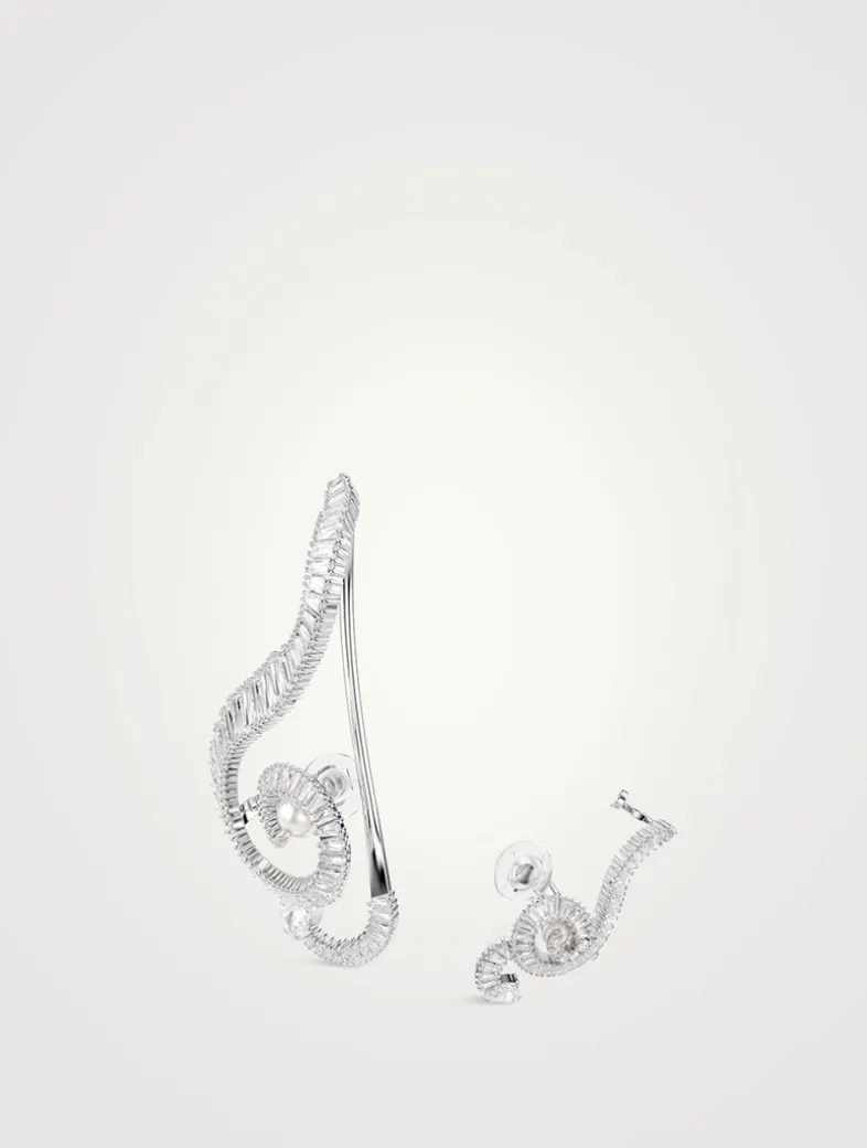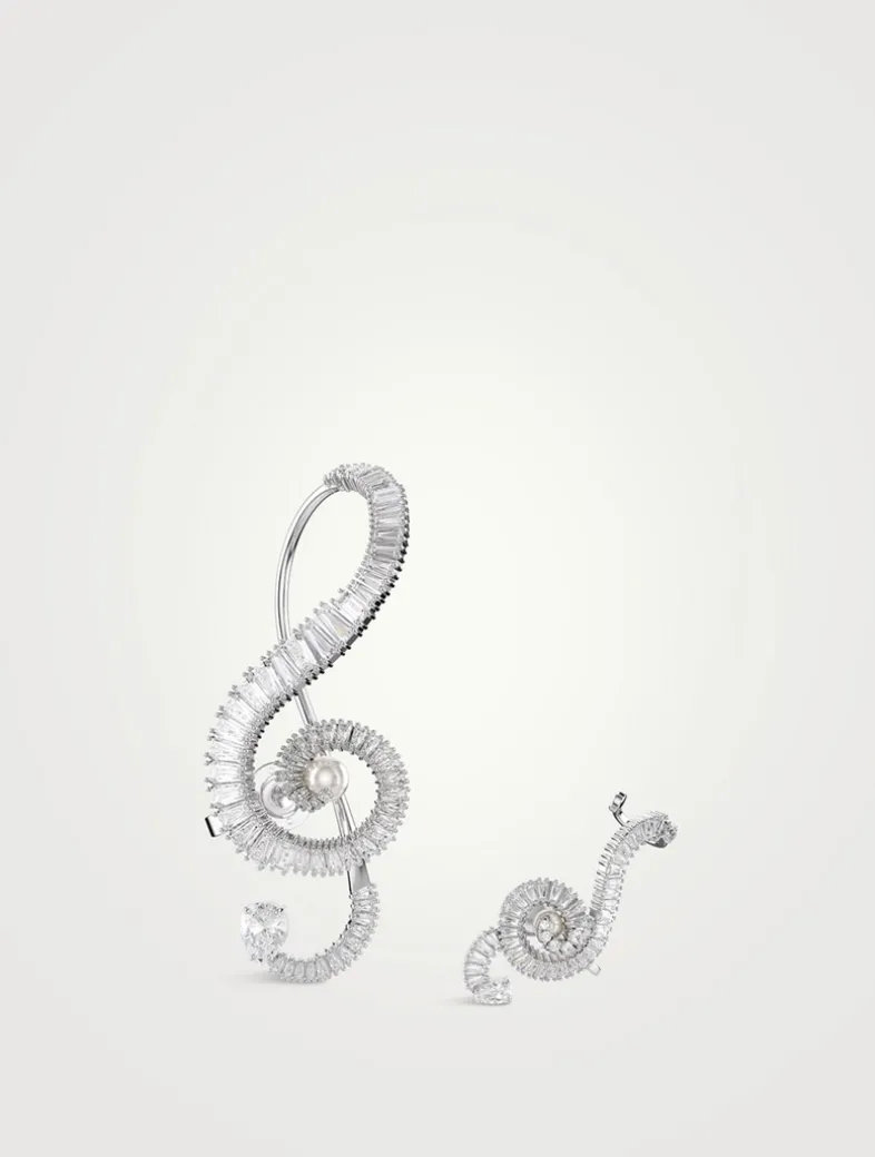 Co-created with Ariana Grande and Swarovski Global Creative Director Giovanna Engelbert, this capsule collection celebrates the love of music and the art of timeless style, combining spellbinding savoir-faire with contemporary cool. These music-inspired earrings take the form of two differently sized treble clefs, beautifully spiraled, rhodium-plated, and set with baguette-cut Swarovski Zirconia. The design is punctuated with a single Swarovski Crystal Pearl placed at the centre.