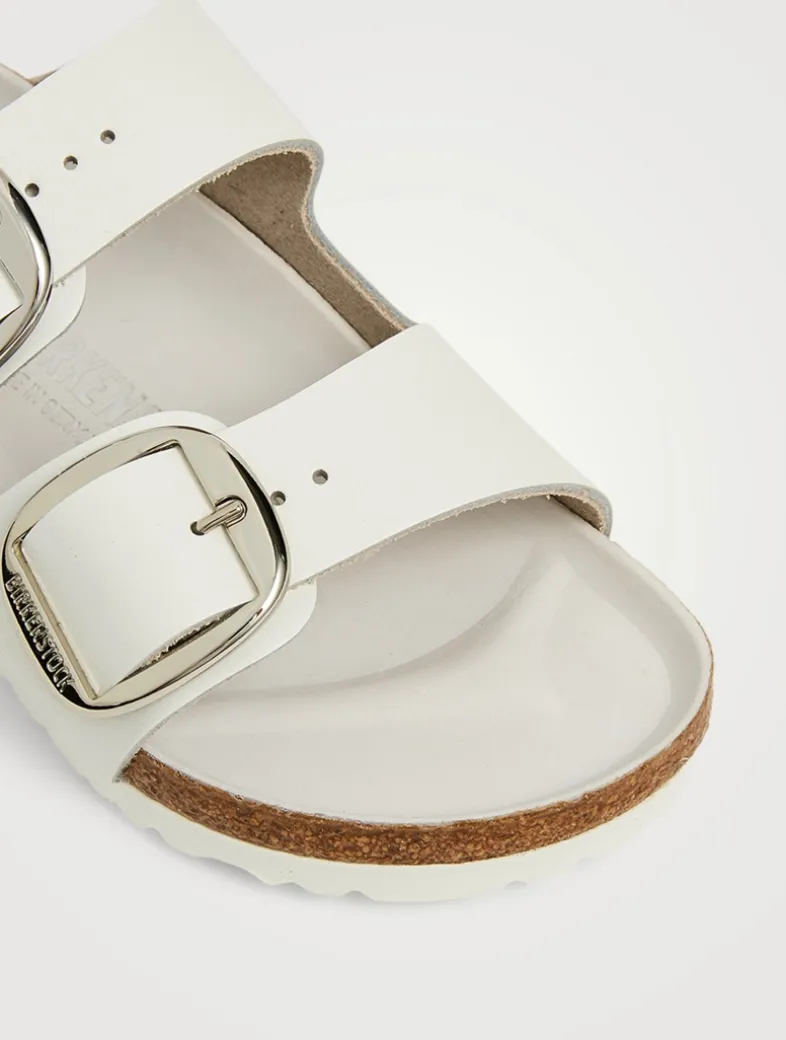 These iconic double-strap flat sandals in leather are updated with two oversized, shiny metal pin buckles. The slip-on style is designed with a comfortable, anatomically formed cork and latex footbed covered with suede.