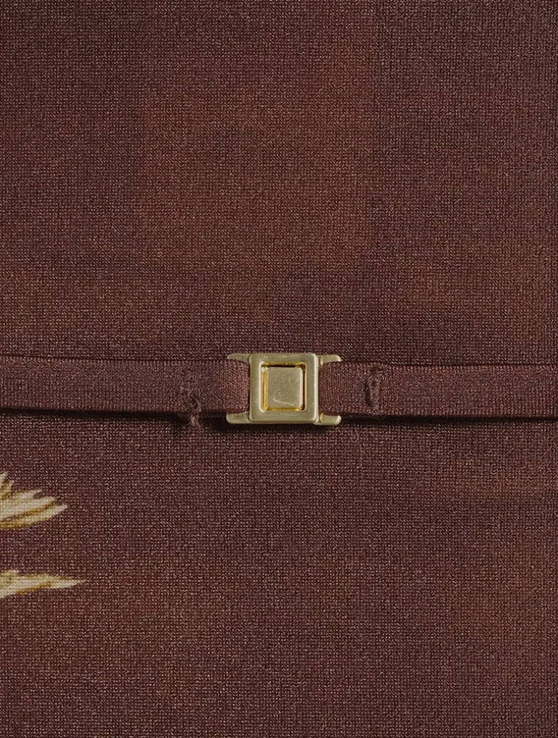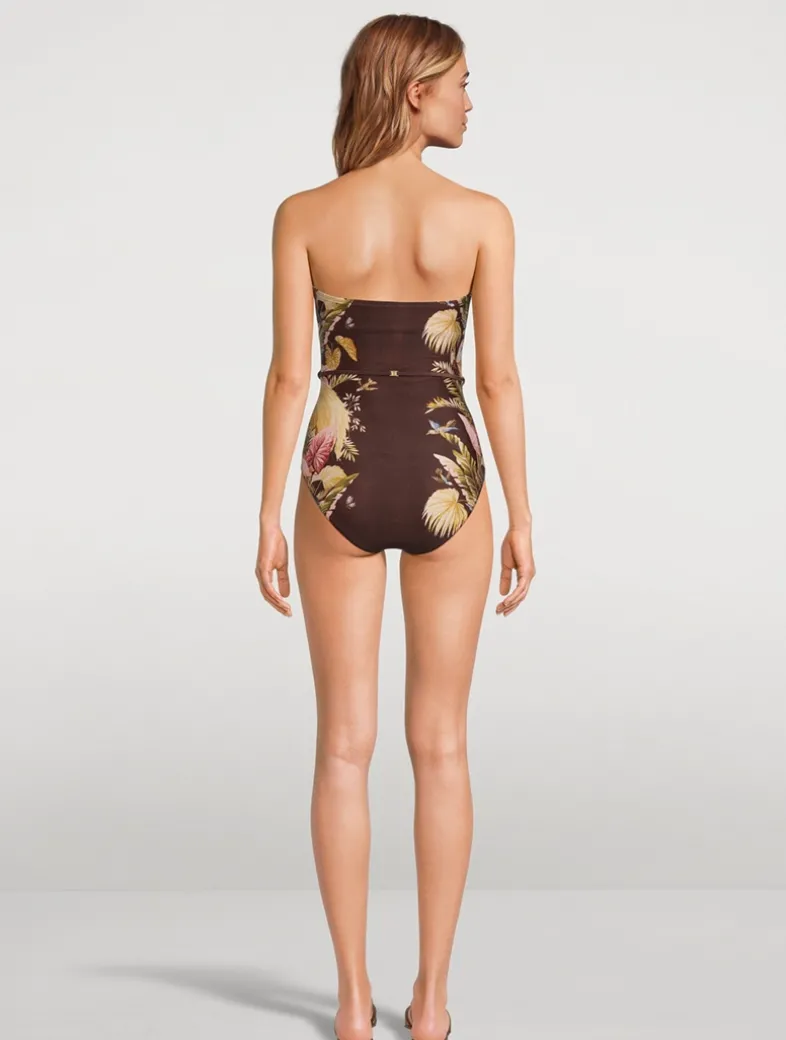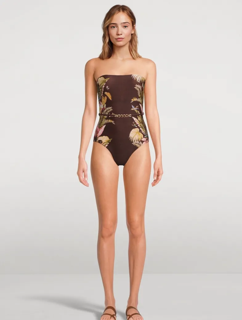 Crafted from Lycra, this bandeau-style one piece features a shelf bra, boning in the side seams, and gripper elastic at the front neck, ensuring the perfect fit. It is embellished with a removable chain-trimmed belt.