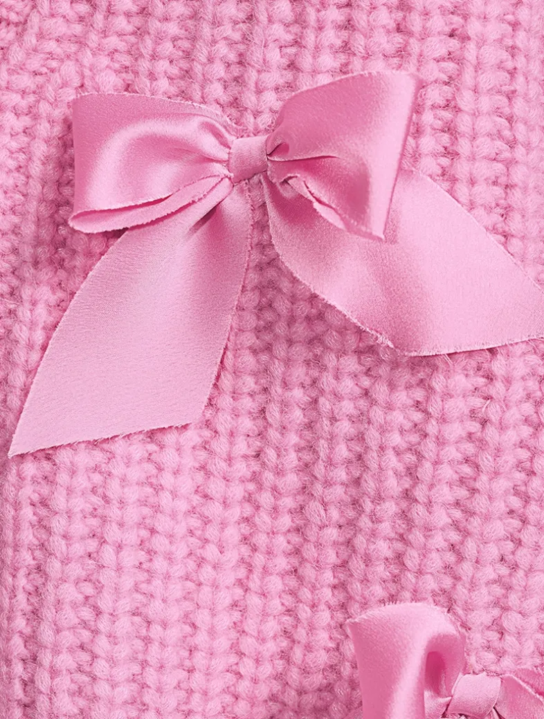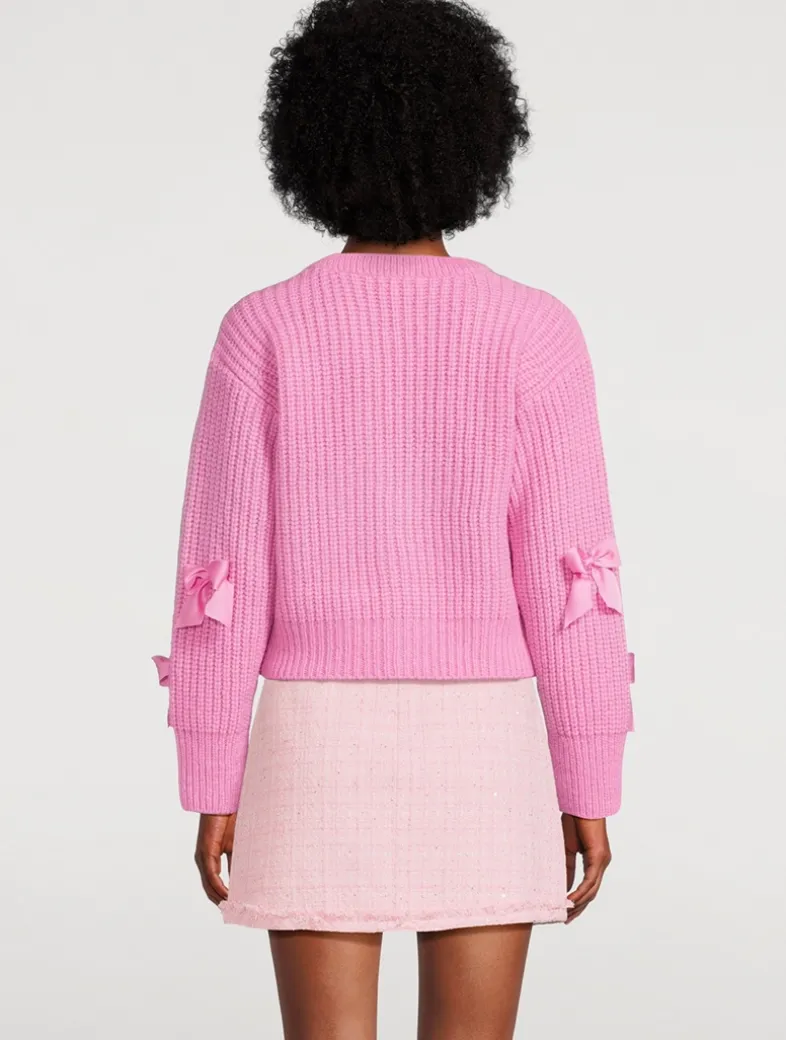 Knit in Peru, this pretty sweater is designed from a warm alpaca and wool blend for a cozy look and feel. The must-have cardigan features tonal charmeuse bows thoughtfully placed all over for that signature LoveShackFancy touch.