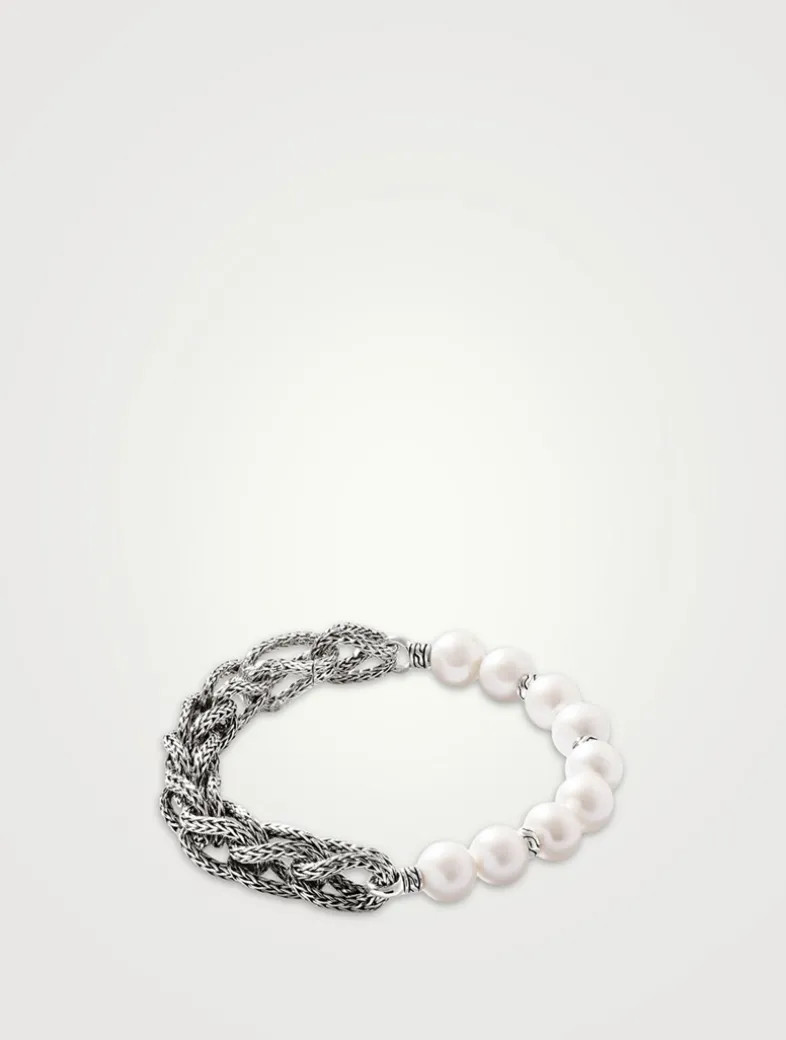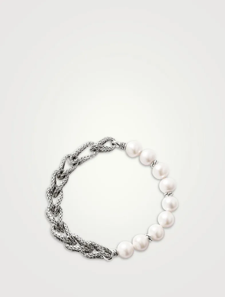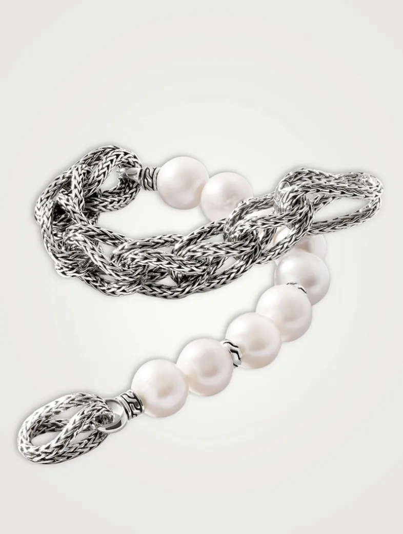 With on-trend cultured freshwater pearls, this JOHN HARDY bracelet is a must-own accent. The delicate pearls are in contrast to the rope chain with the brand’s signature link motif.