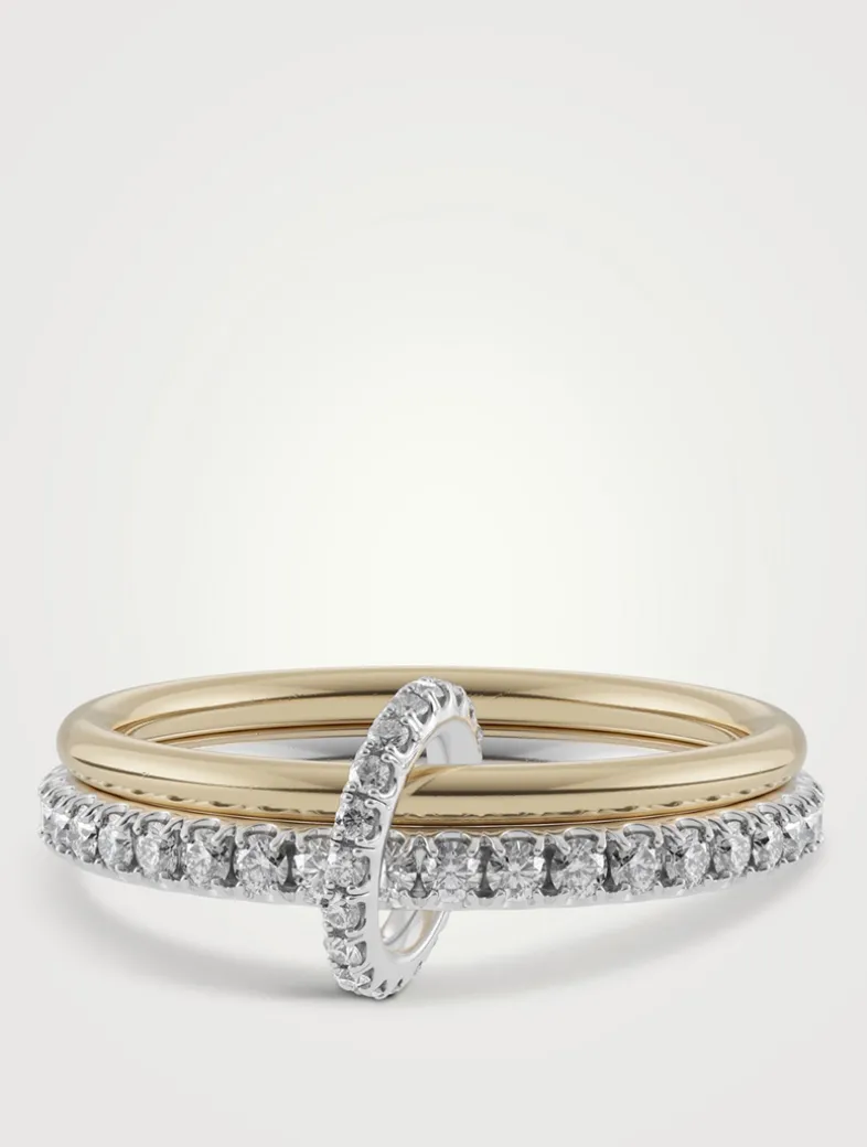 Comprised of two linked bands in mixed metals of 18k yellow gold and .925 sterling silver, this piece is accented with pavé-set gray diamonds. Individually handmade in downtown Los Angeles.