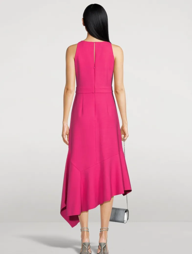 This classic dress is crafted from vibrant double-faced stretch wool. A fitted bodice gives it a tailored silhouette, while a striking asymmetrical hemline adds modern dimension.
