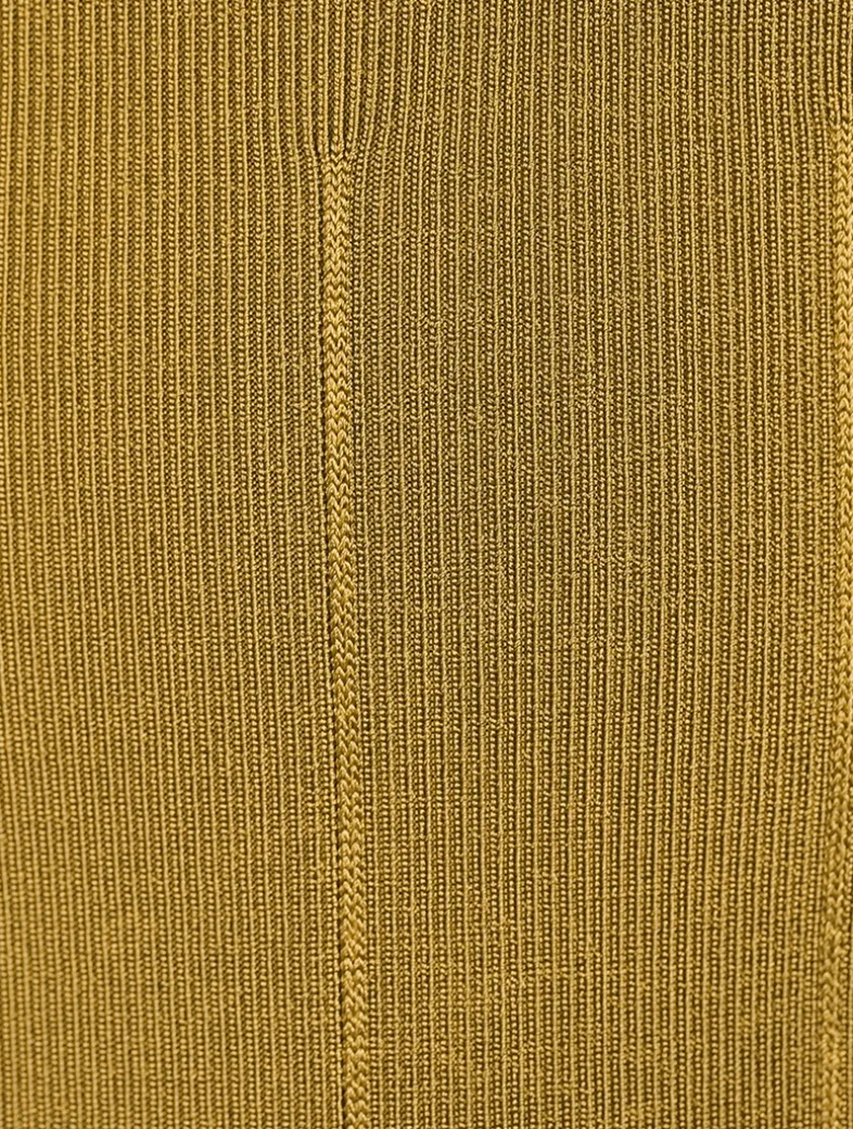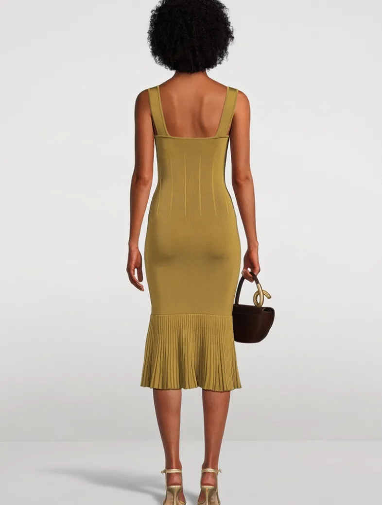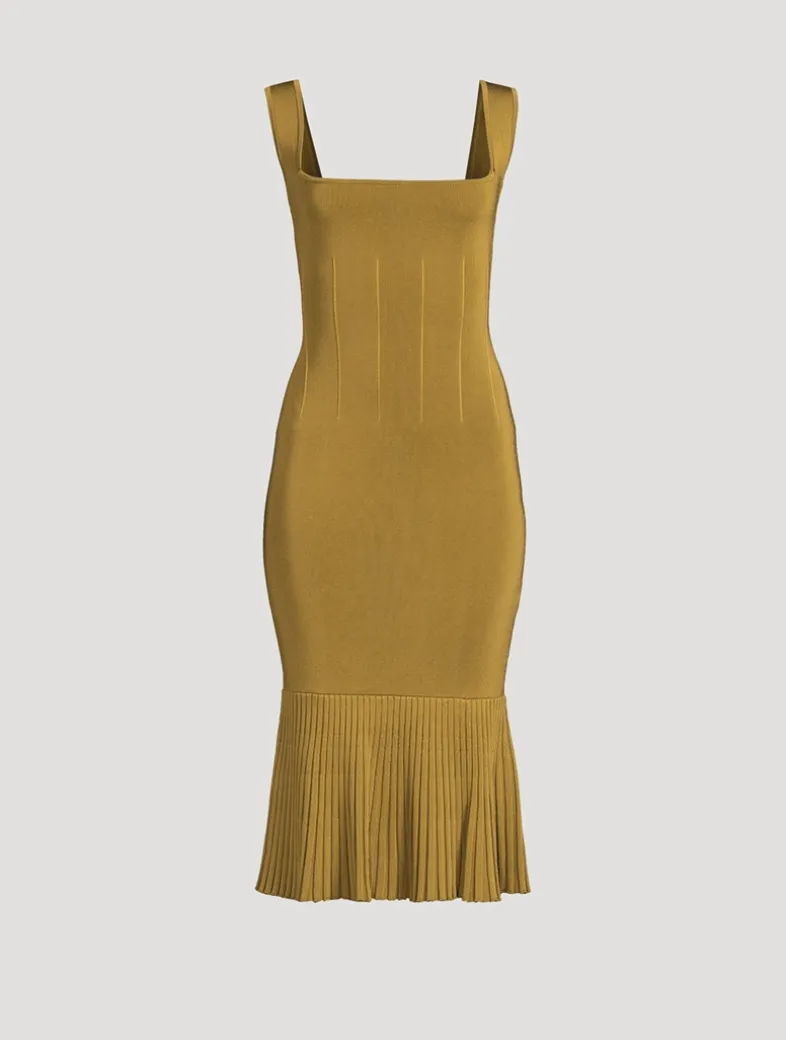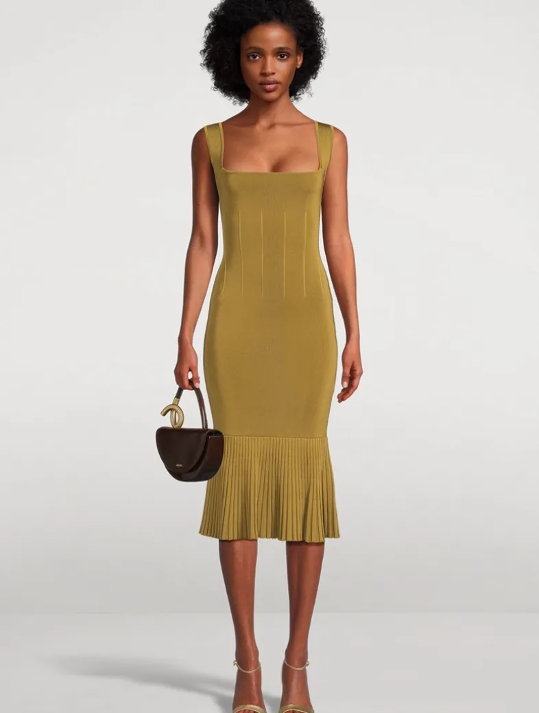The Atalanta Dress’s ribbed and structured body is reflected in the flared and ribbed ruffle hemline, which ends just below the knee, while its décolletage is defined by GALVAN’s signature square neckline.