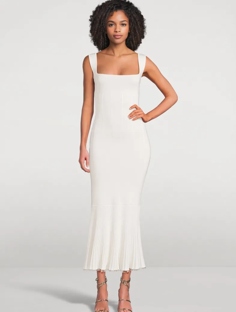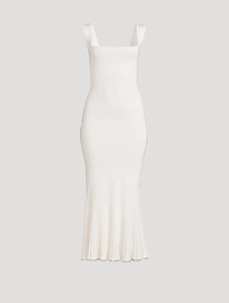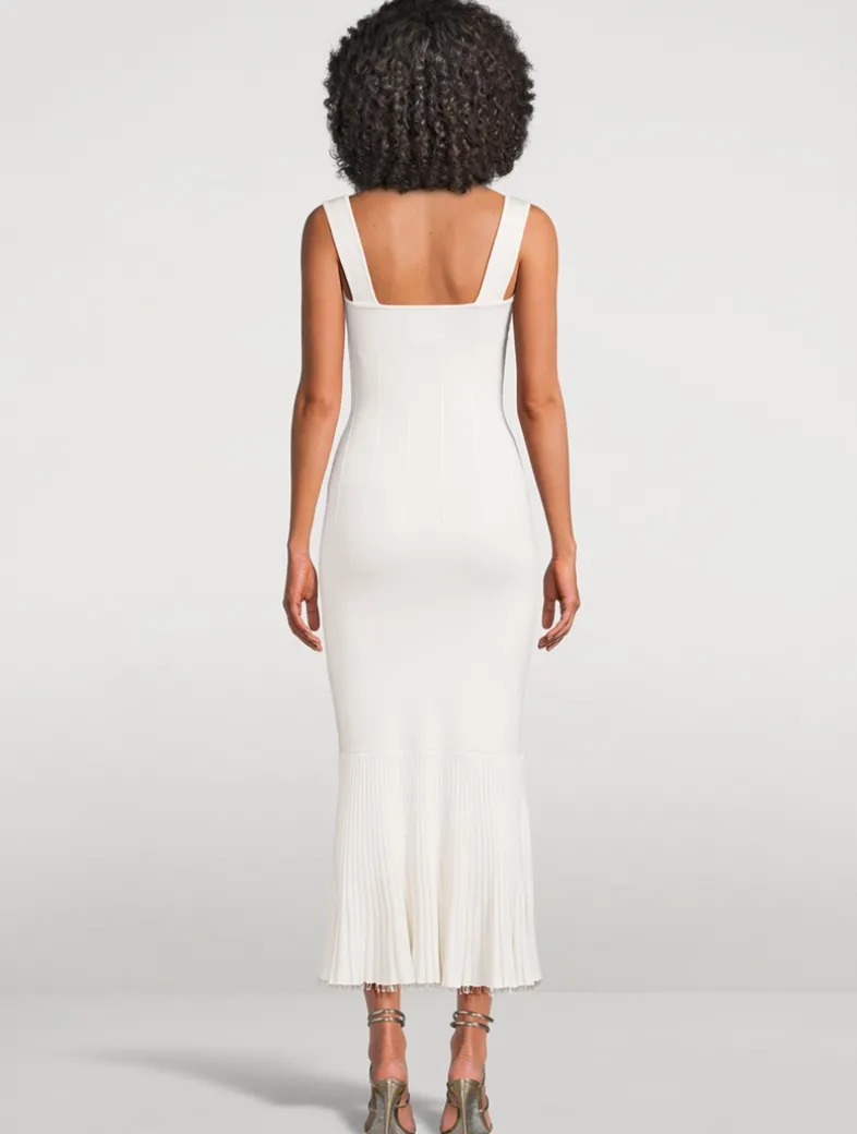 The Atalanta Dress’s ribbed and structured body is reflected in the flared and ribbed ruffle hemline, which ends just below the knee, while its décolletage is defined by GALVAN’s signature square neckline.