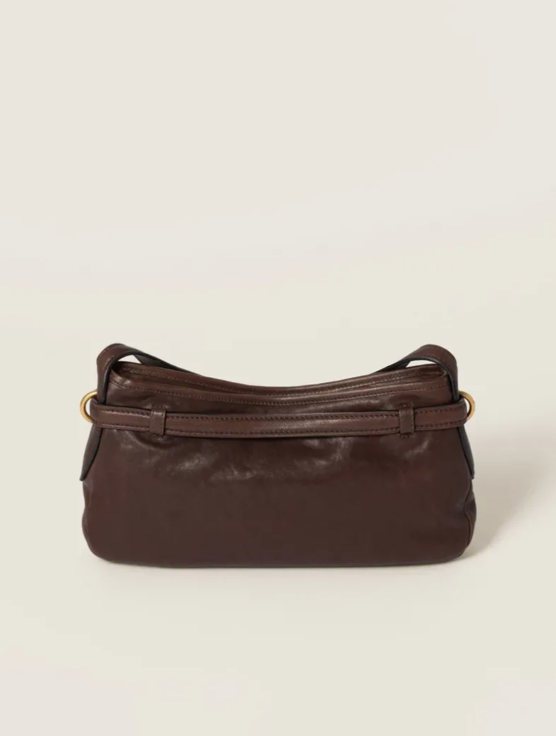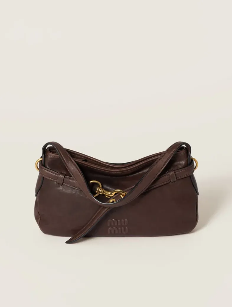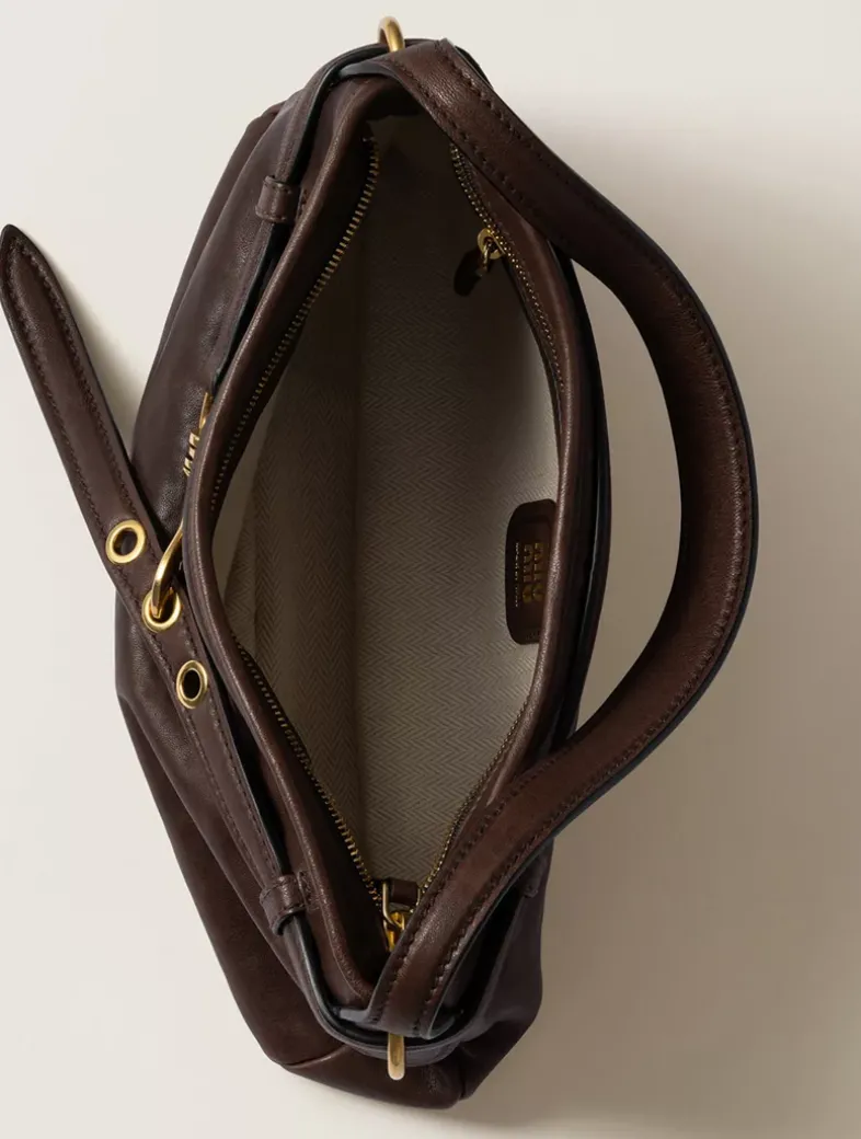 Leather strap for use as a handbag or shoulder bag Antiqued gold-tone hardware Zipper closure Cotton lining with zipper pocket Embossed lettering logo on the front