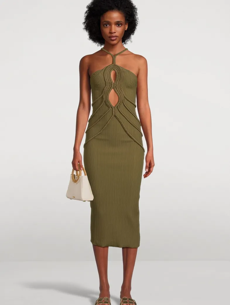 Cut to a curve-hugging silhouette, this midi-length dress has a halter neckline framed by slim shoulder straps that can be adjusted for the perfect fit. It has a ribbed knit construction embellished with tonal rope dealing around the bodice.