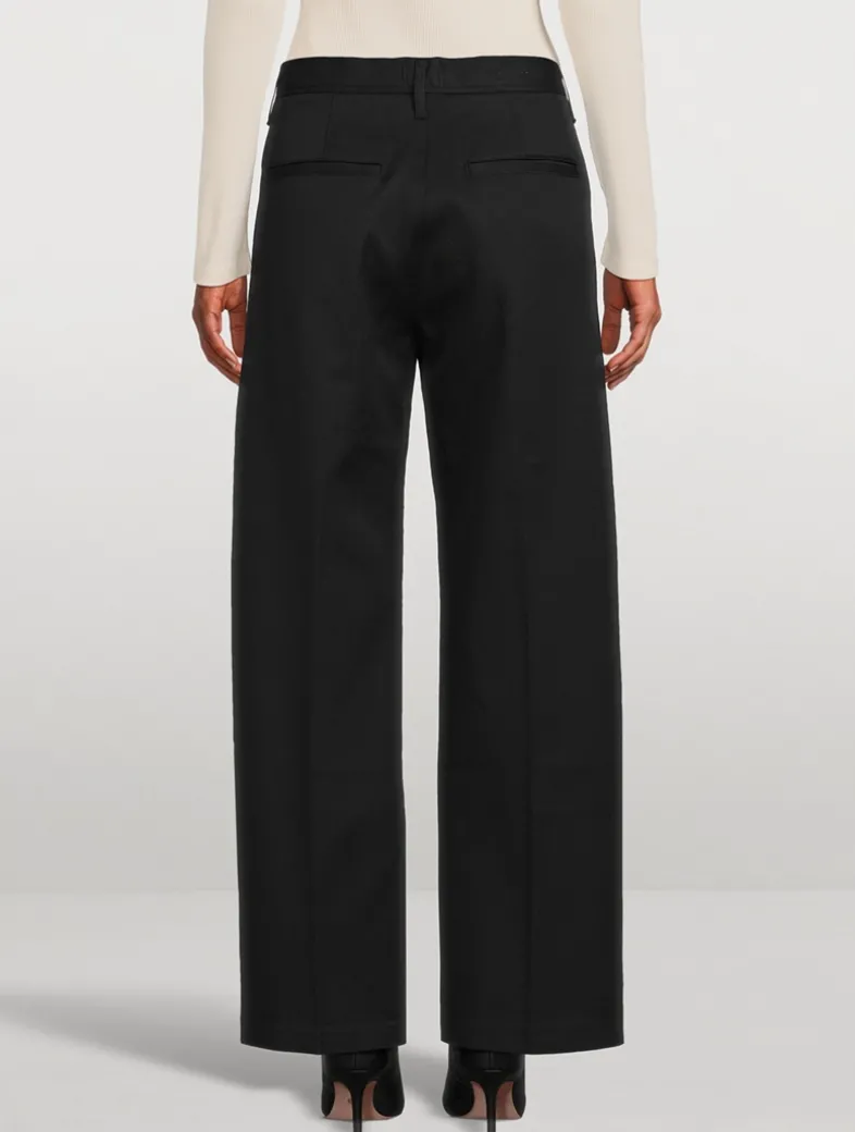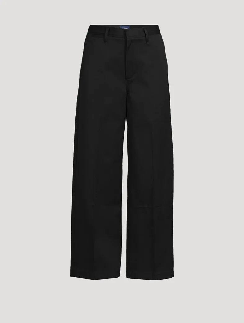 Designed with a square top block and clean, trouser silhouette with a subtle tapered leg. The wide-leg pair are crafted from a lightweight and breathable, non-stretch, rigid twill.