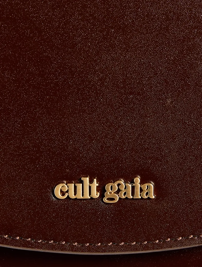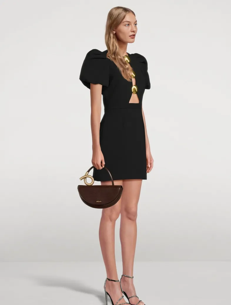 This bag’s top handle silhouette is designed in a half moon shape and detailed with sculptural brass-tone hardware that coils at the handle. Features an exterior slip pocket, an interior zip pocket, and three interior card slots.