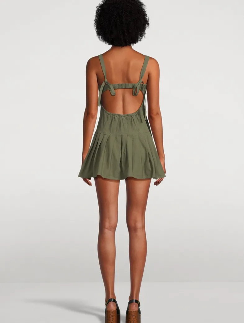 Soft, durable, and breathable, this style is made from 100% natural cotton. Forever femme and just as romantic, this sweet mini features ruched seaming at the bust, a sweetheart neckline, and a cut-out detail at the back with tied straps.