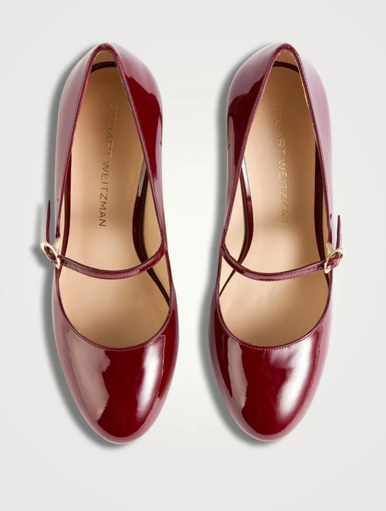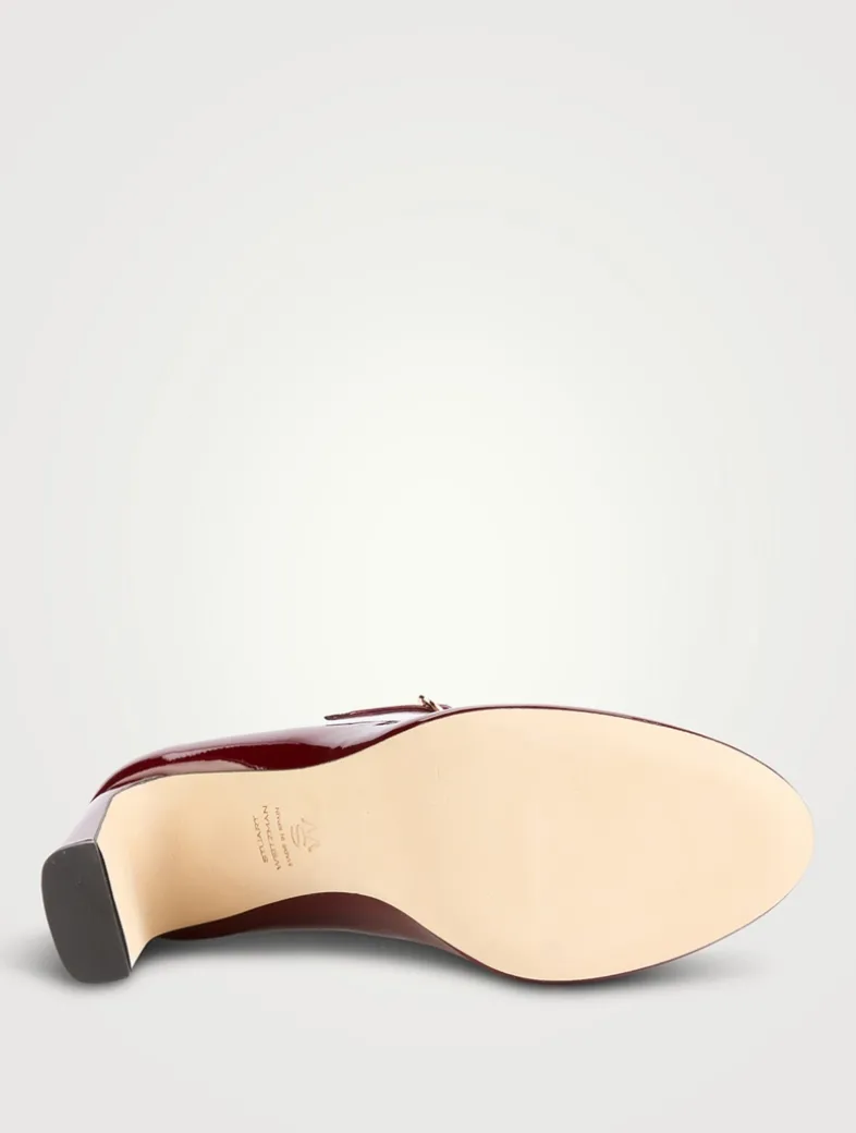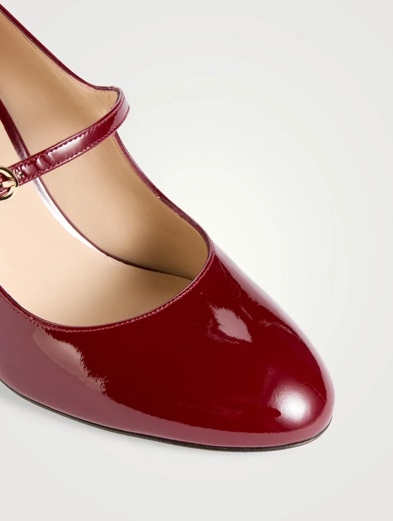 These block-heel pumps are crafted from a glossy patent leather and finished with an almond toe and a slim Mary Jane strap.