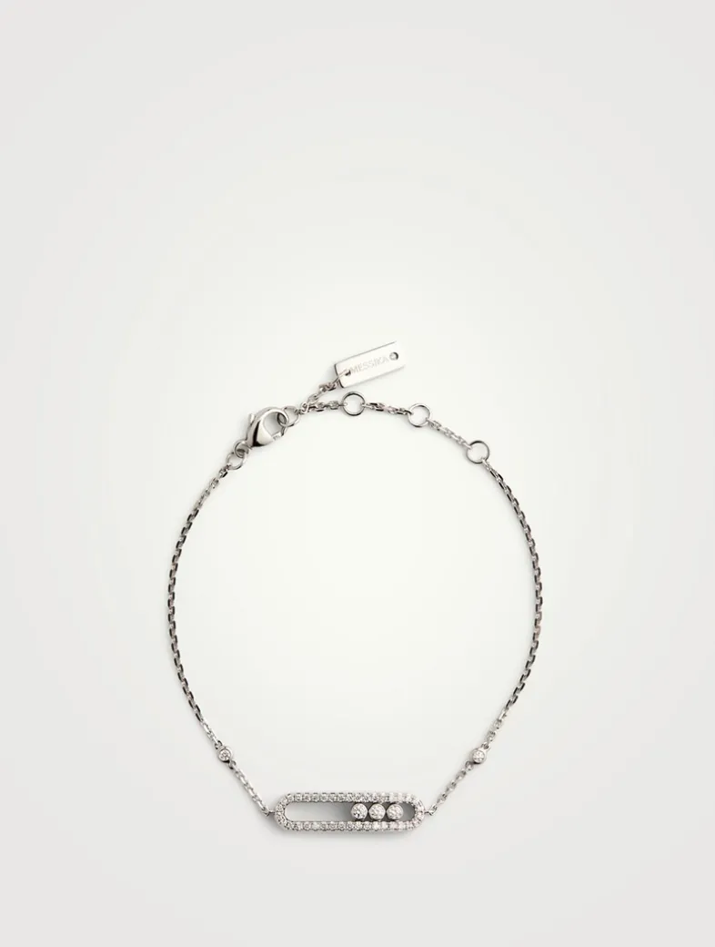 This diamond bracelet, which is fully handcrafted, is part of Messika’s Baby Move luxury jewellery collection. With its three moving diamonds that shine according to one’s movements, this bracelet is the ideal everyday companion with its pared down graphic style and delicate chain.