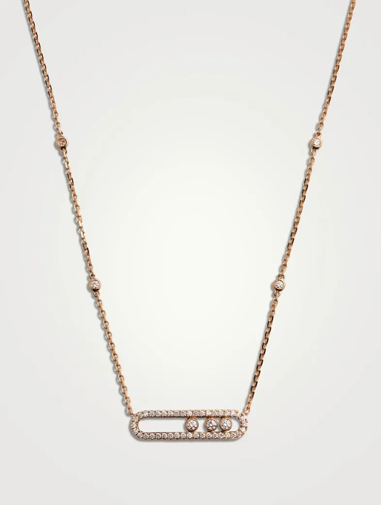Fall for the 18k white gold pavé diamond necklace from the Baby Move luxury jewellery collection. Fully handcrafted with Messika’s signature three moving diamonds, symbolizing the love of yesterday, today, and tomorrow. Note the precious detail on this yellow gold pavé diamond necklace: the adorning diamonds on the chain.