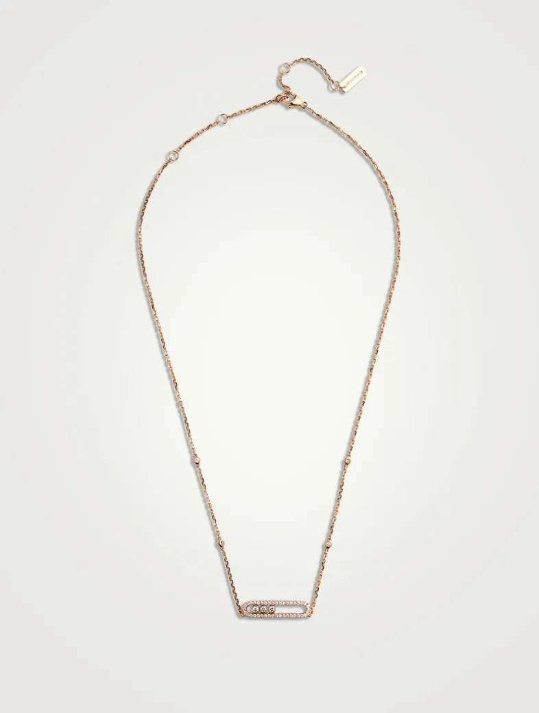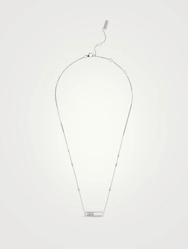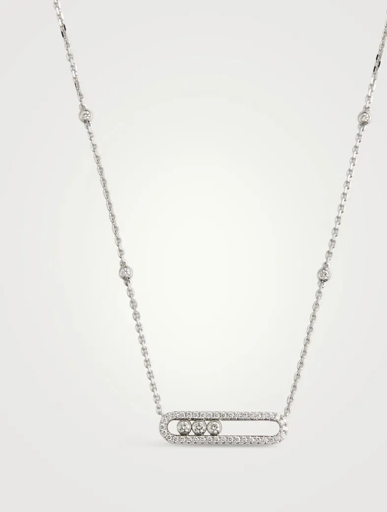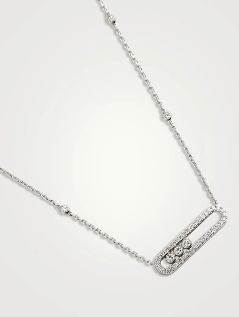 Fall for the 18k white gold pavé diamond necklace from the Baby Move luxury jewellery collection. Fully handcrafted with Messika’s signature three moving diamonds, symbolizing the love of yesterday, today, and tomorrow. Note the precious detail on this yellow gold pavé diamond necklace: the adorning diamonds on the chain.