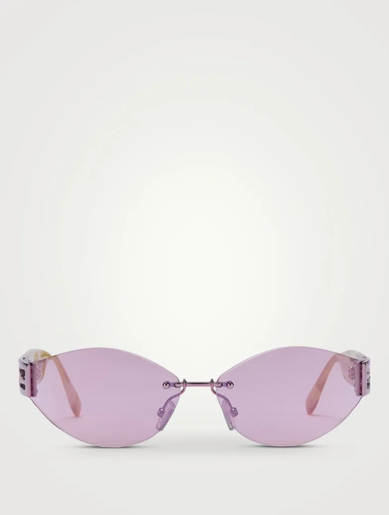 An evolution of the iconic baguette family, featuring the notorious baguette logo on the side. Inspired by vintage Fendi eyewear, modern meets vintage in the wrap-around rimless lenses, joining the acetate temples.
