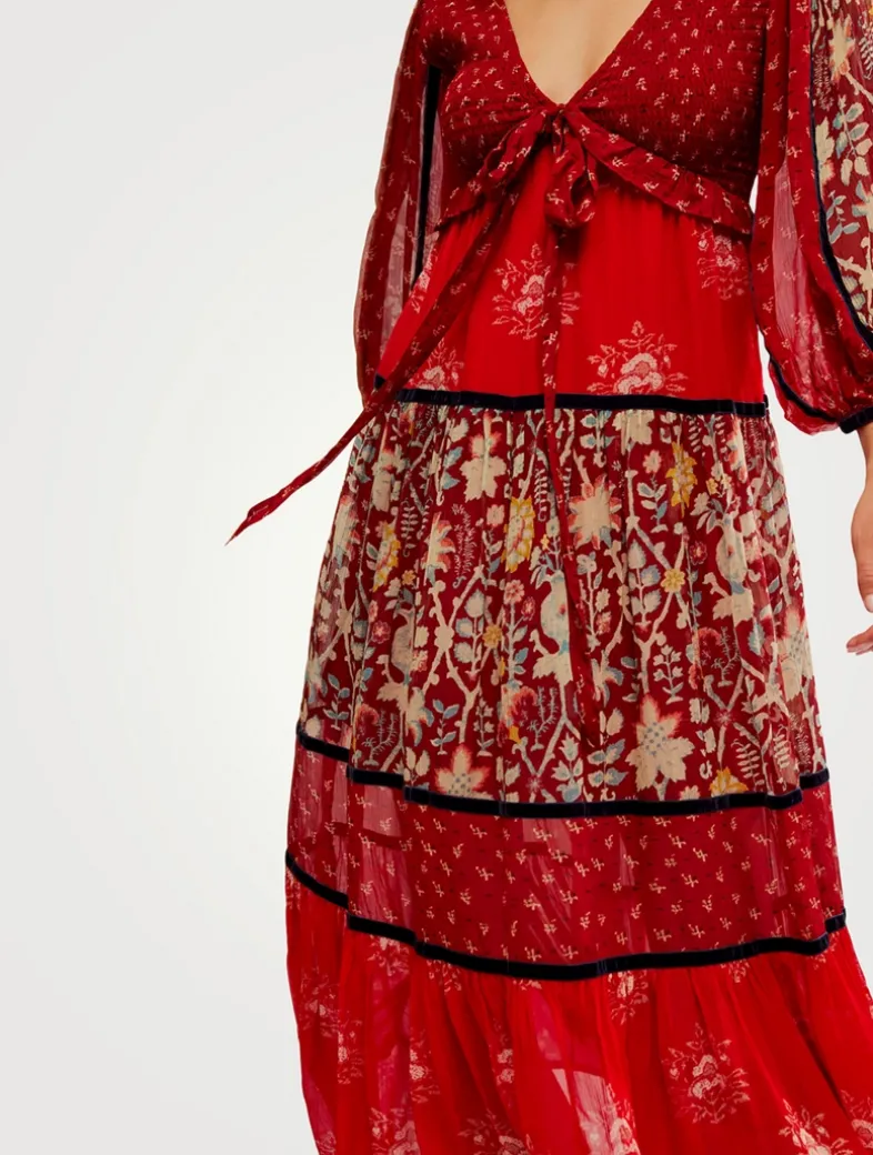 Elevated and beautifully printed maxi dress flaunting a mix of floral design. It has a smocked bodice and a plunging V-neckline framed by puffed sleeves with elastic cuffs.