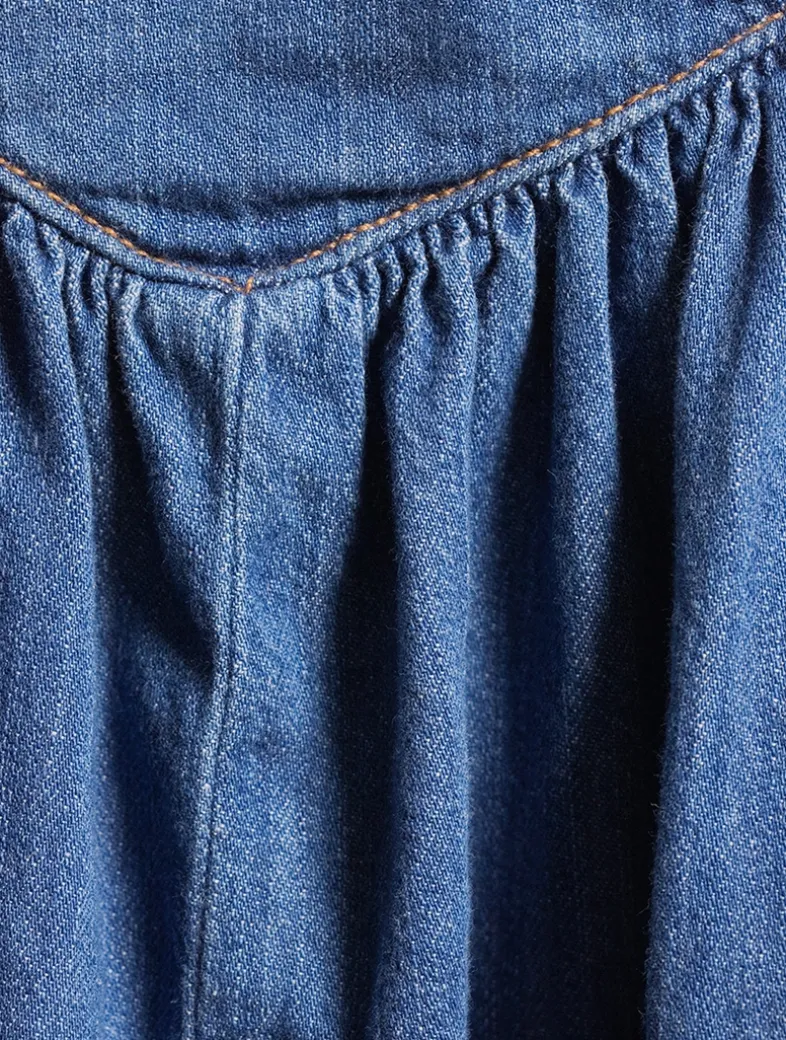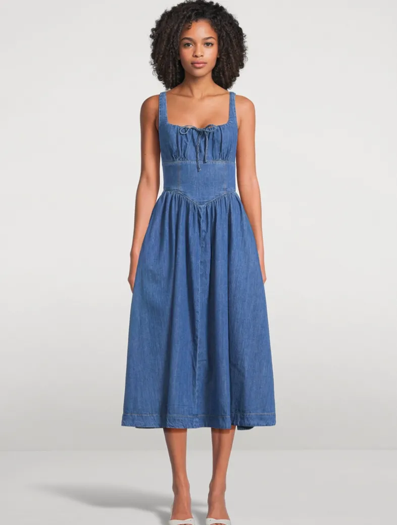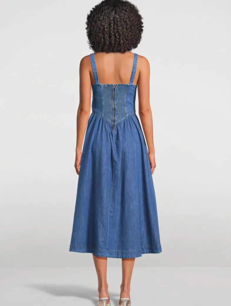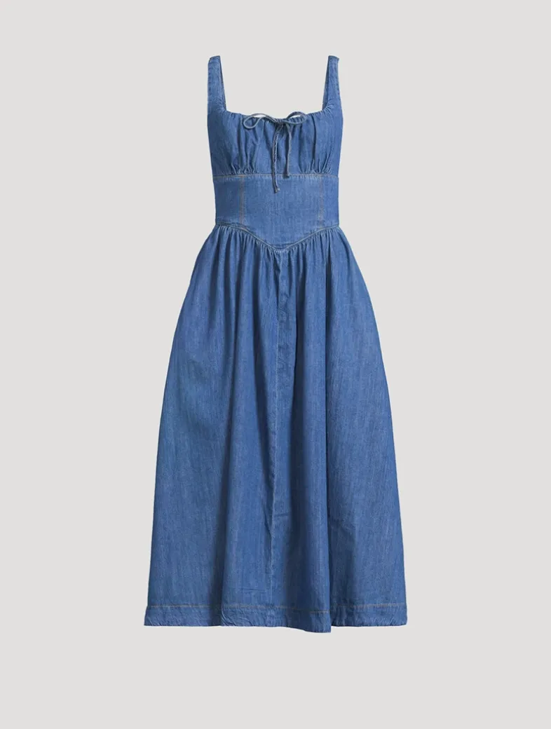 A corset-style bodice defines this non-stretch denim twill midi dress, which is designed with smocking at the back, a voluminous skirt, and delicate tie at the bust.