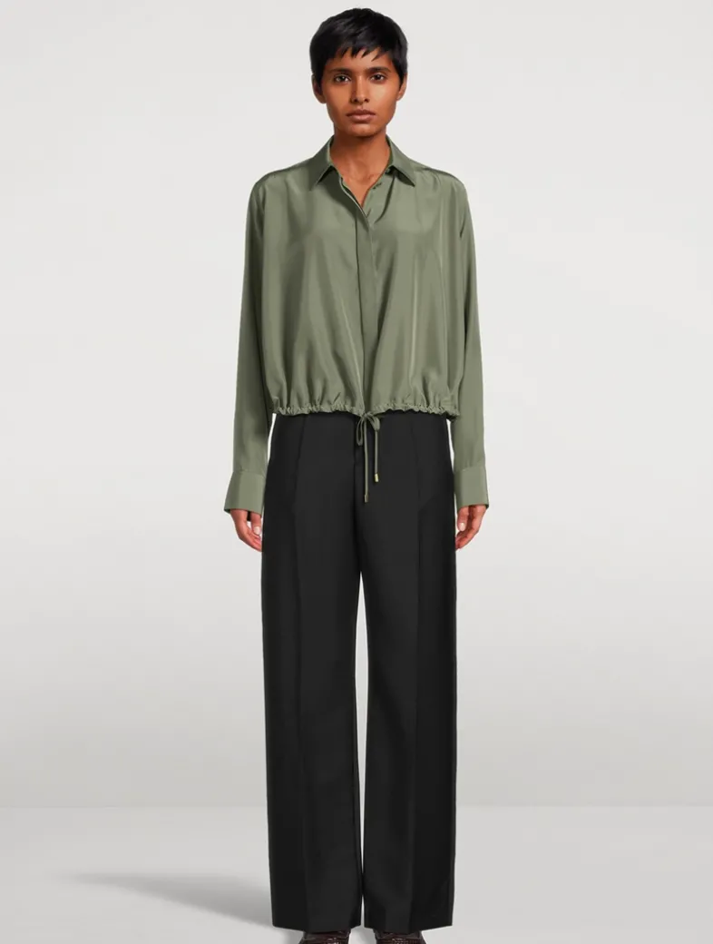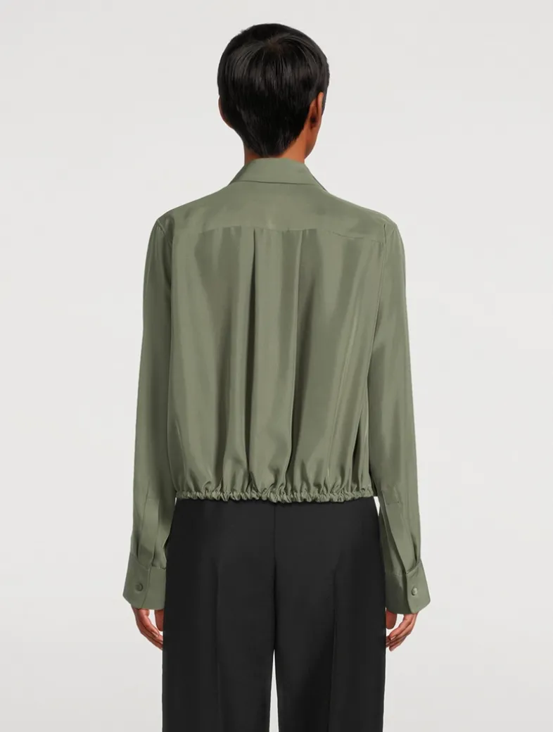 Crafted in a lightweight matte silk crêpe, this long-sleeve shirt features a balloon silhouette with adjustable drawstring hem. It has a concealed button front fastening and Anagram embroidery placed at the cuff.