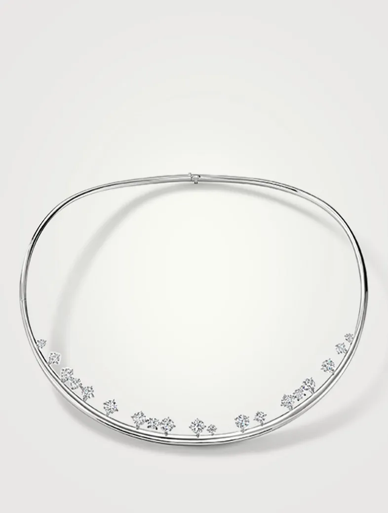 Delicate diamond drops float above the curved gold bar to create a contemporary neckpiece that shines.