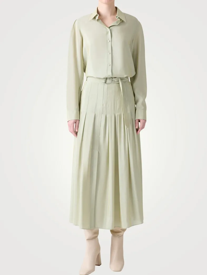 This long-sleeve shirt is made from a viscose-blend batiste fabric with a subtle sheen. It has delicate gathering at the shoulders, a buttoned closure, and buttoned cuffs.