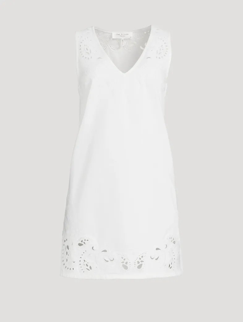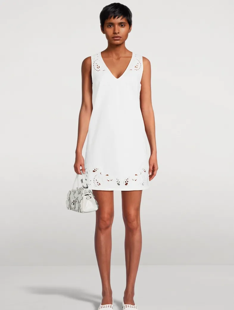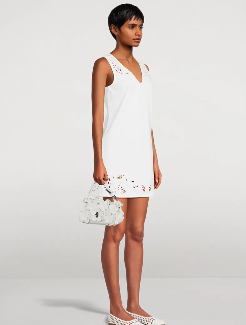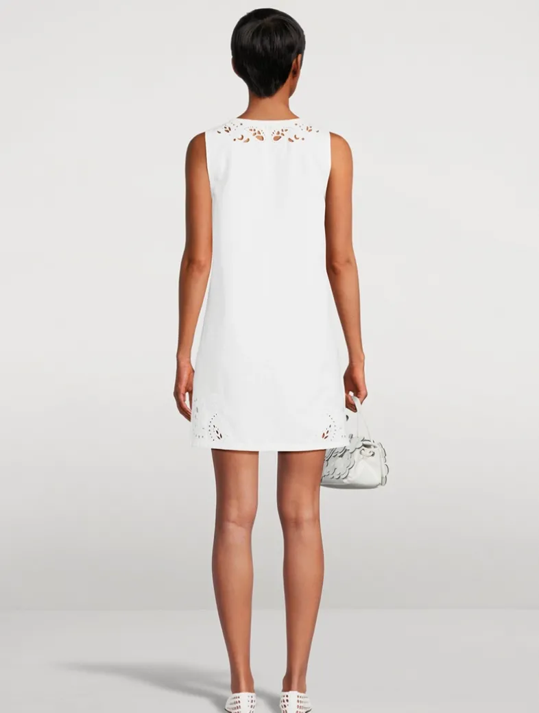 This sleeveless mini is cut for a 1960s-inspired shift silhouette from crisp cotton-blend poplin. The simple dress is finished with floral lace embroidery with cut-out details along the shoulders and hem.