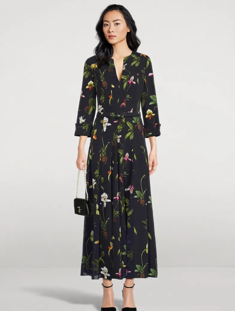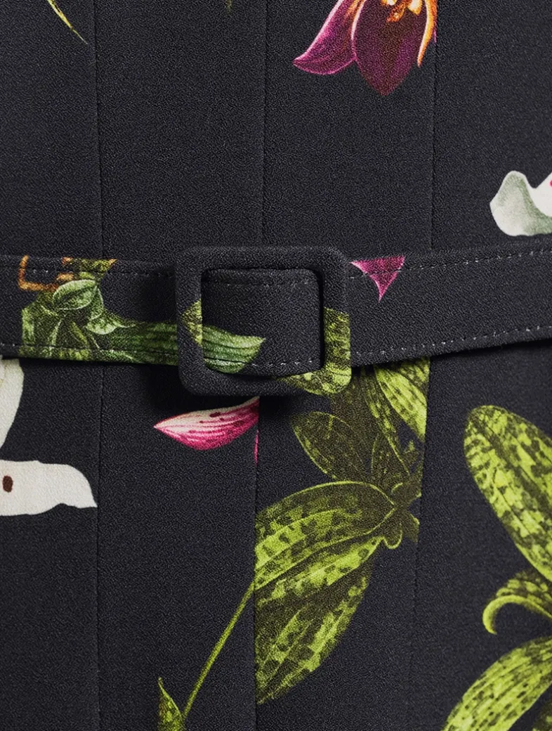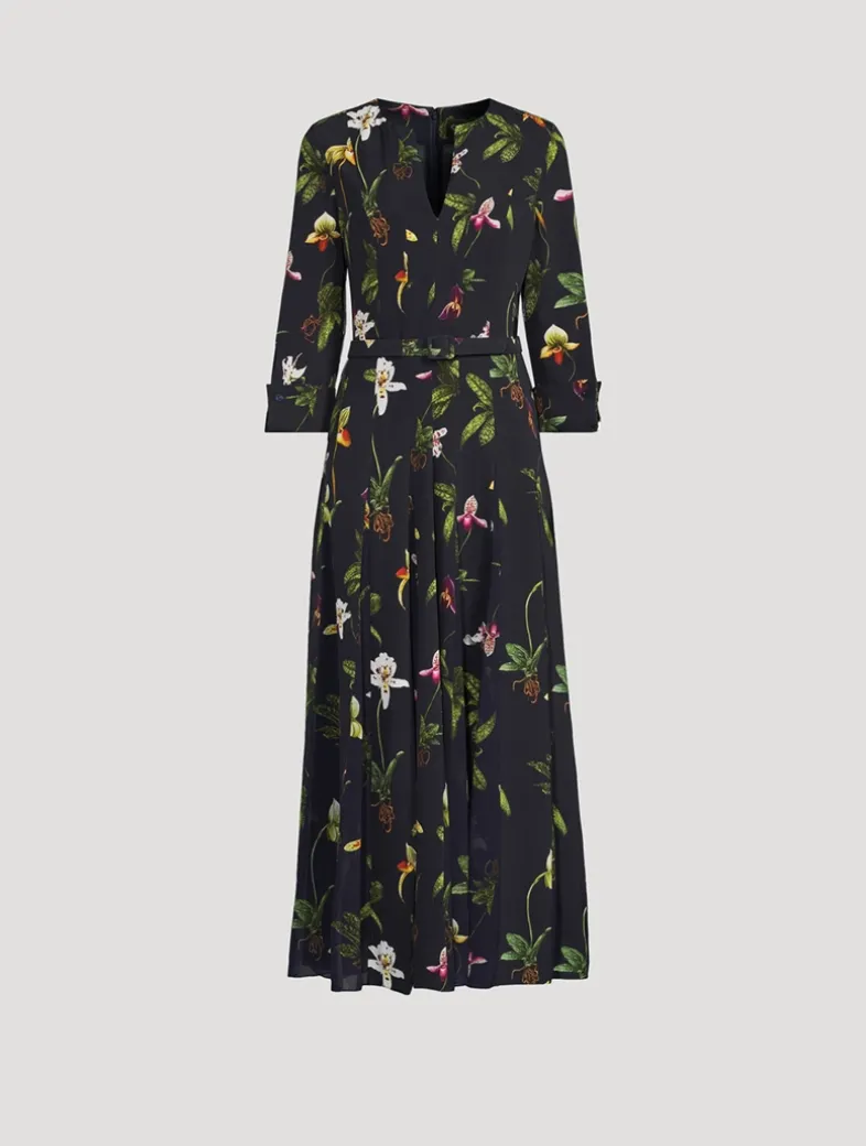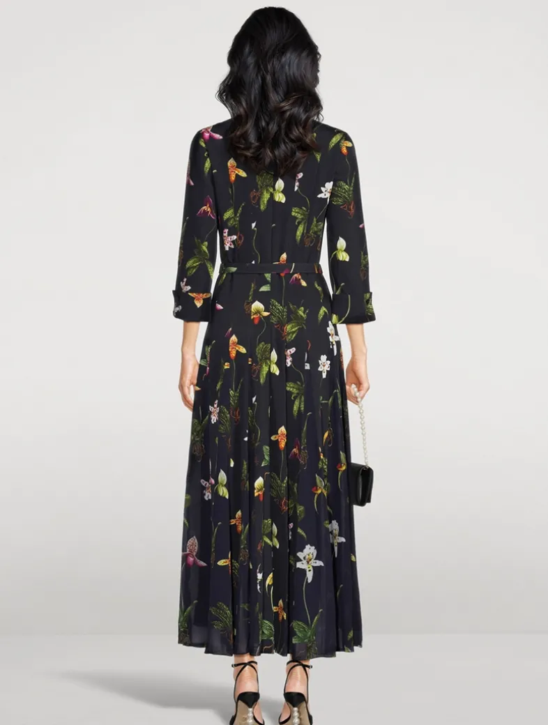 Work this season’s orchid motif into everyday looks with this cady dress that boasts a panelled construction which falls to a skirt of contrasting silk chiffon pleats that swish with every step. Finished with a matching fabric belt to define your waist.