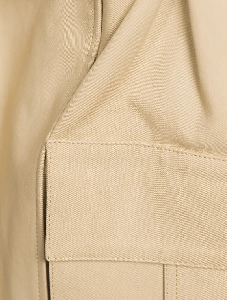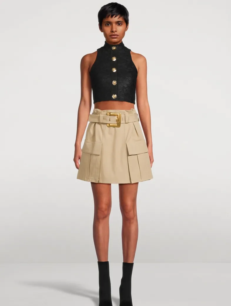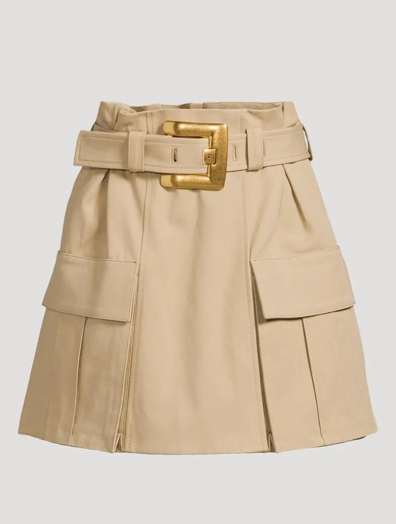 Crafted from a crisp cotton gabardine, this skirt mixes utilitarian styling with chic details. It has a high-rise, paper-bag waist cinched by a fabric belt with gleaming gold-tone buckle. Cut to an A-line silhouette, the mini has cargo pockets and an exposed zip at the rear.
