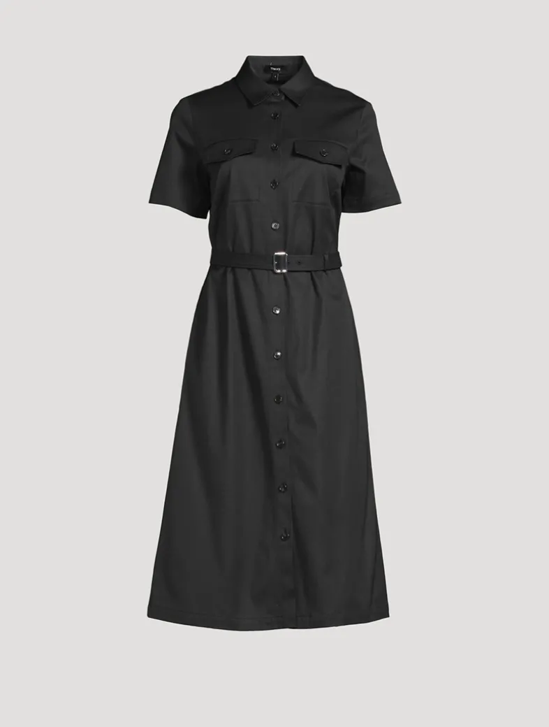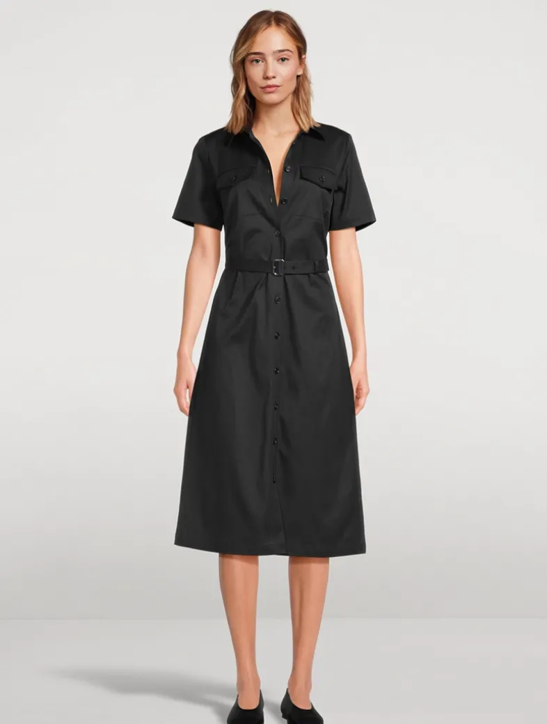 Detailed with a point collar and belted waist, this short-sleeve dress flares into a full skirt that falls just below the knee. Cut for a tailored fit, it’s designed with a strong, comfortable chino structure that’s mercerized to avoid any shrinkage and give the fabric a slight sheen.