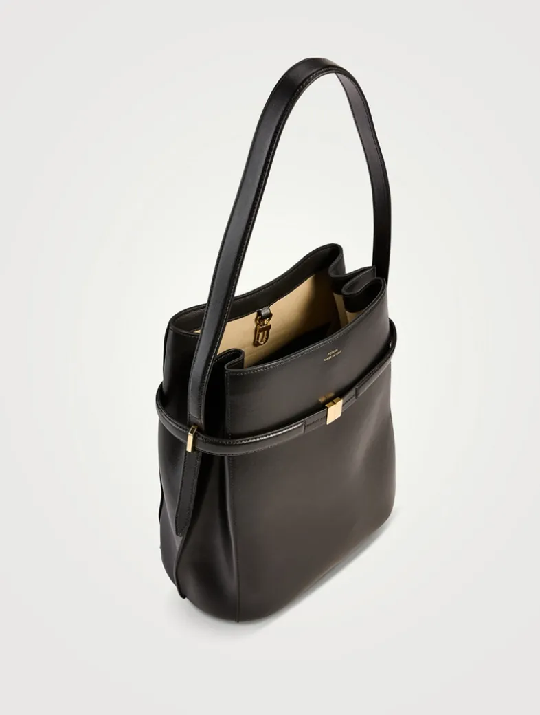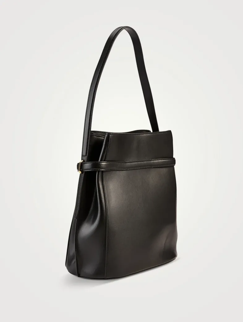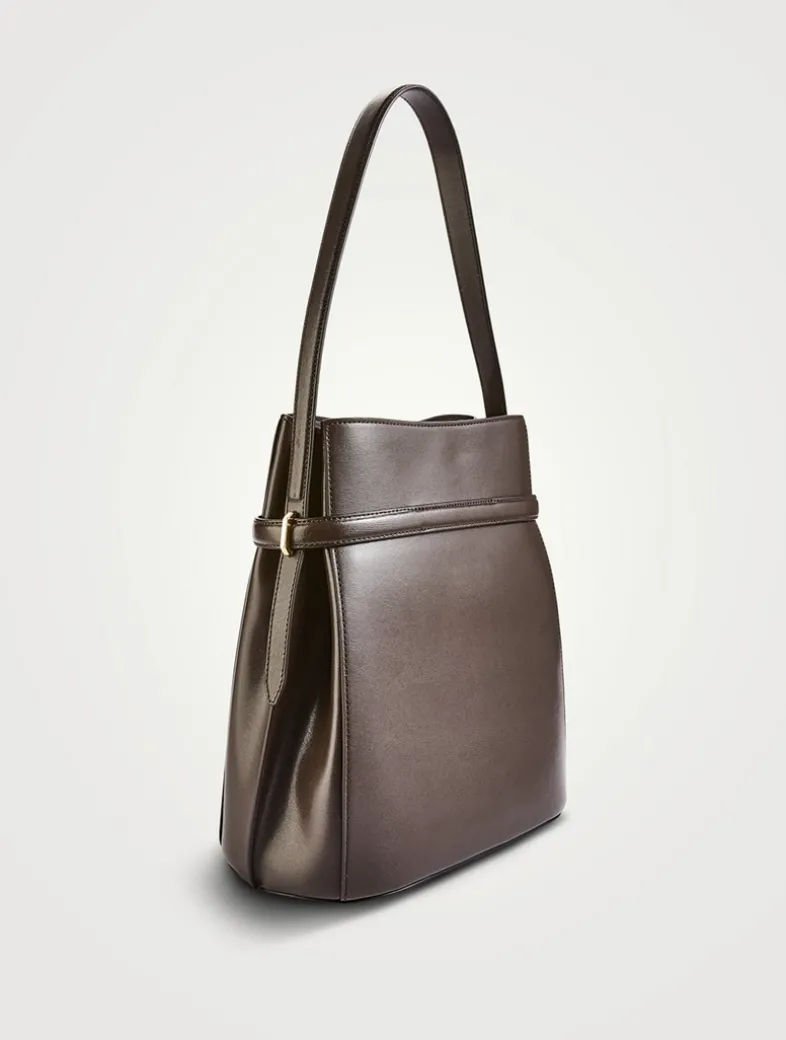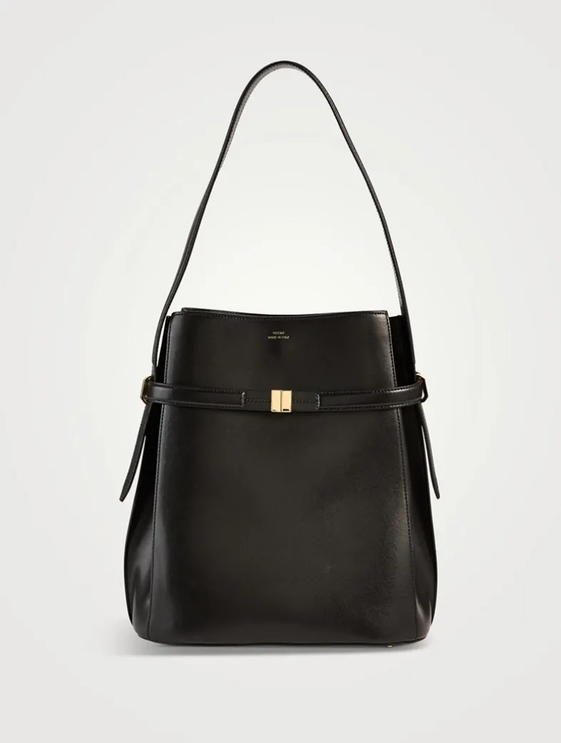 TOTEME bag defined with an elegant belt that can be used to cinch the flattened bucket silhouette or left open at the slide clasp for extra space. It is crafted in Italy from softly textured Palmellatta leather trimmed with gold-tone hardware, then is fitted with two internal slip pockets. Carry it throughout the day from the shoulder strap.