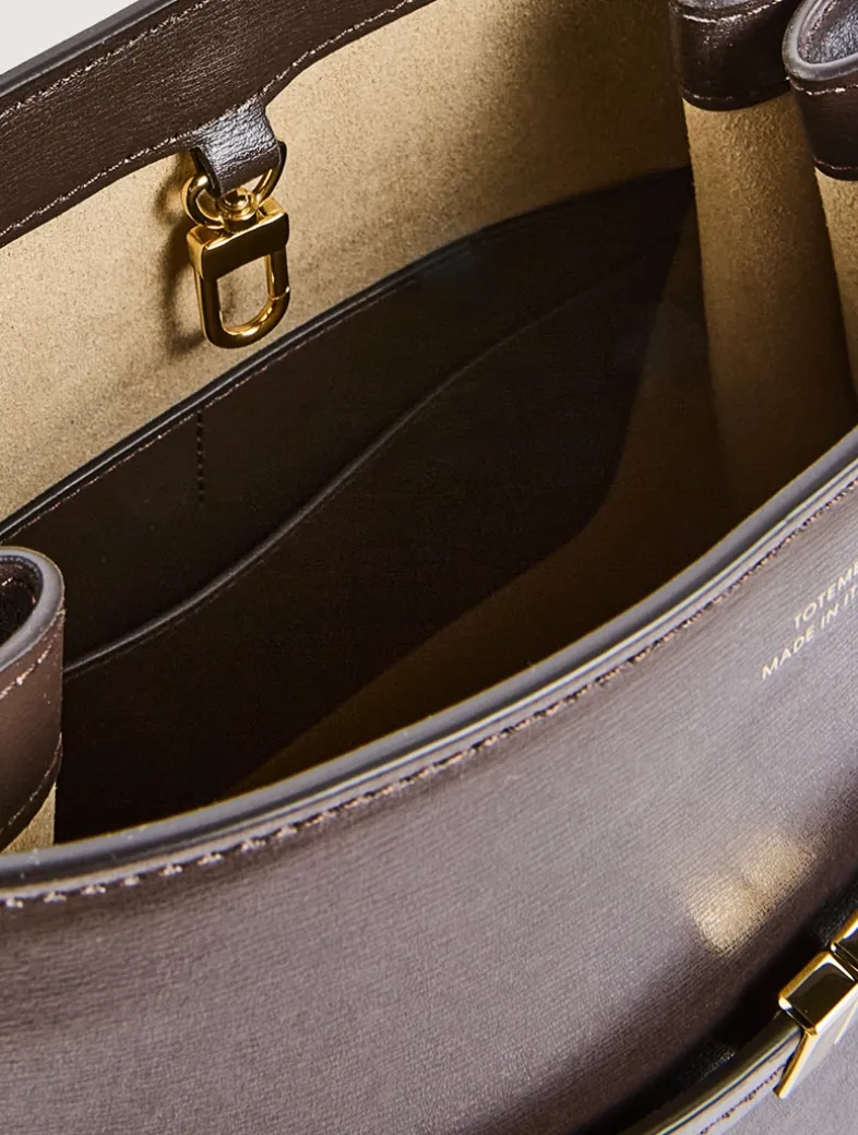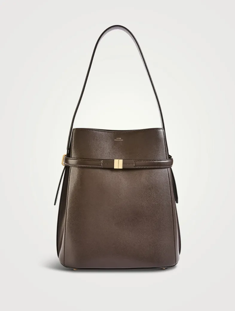 TOTEME bag defined with an elegant belt that can be used to cinch the flattened bucket silhouette or left open at the slide clasp for extra space. It is crafted in Italy from softly textured Palmellatta leather trimmed with gold-tone hardware, then is fitted with two internal slip pockets. Carry it throughout the day from the shoulder strap.