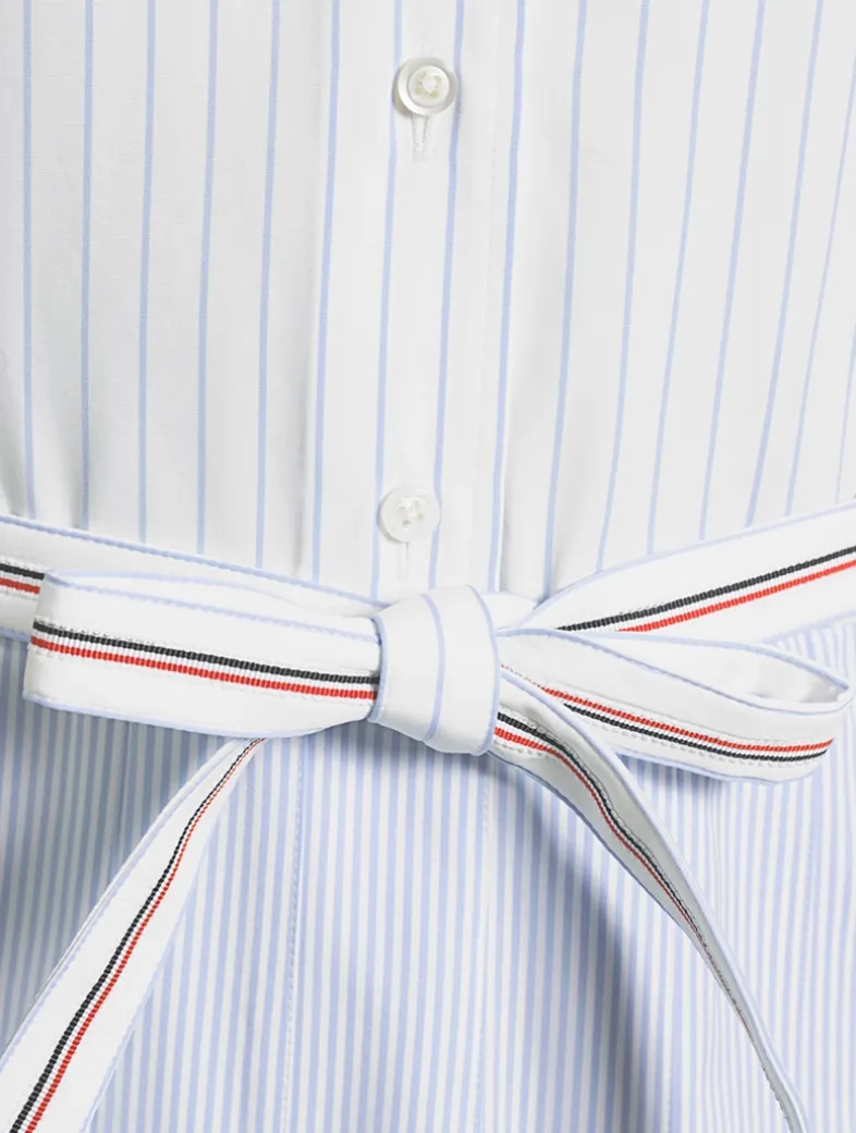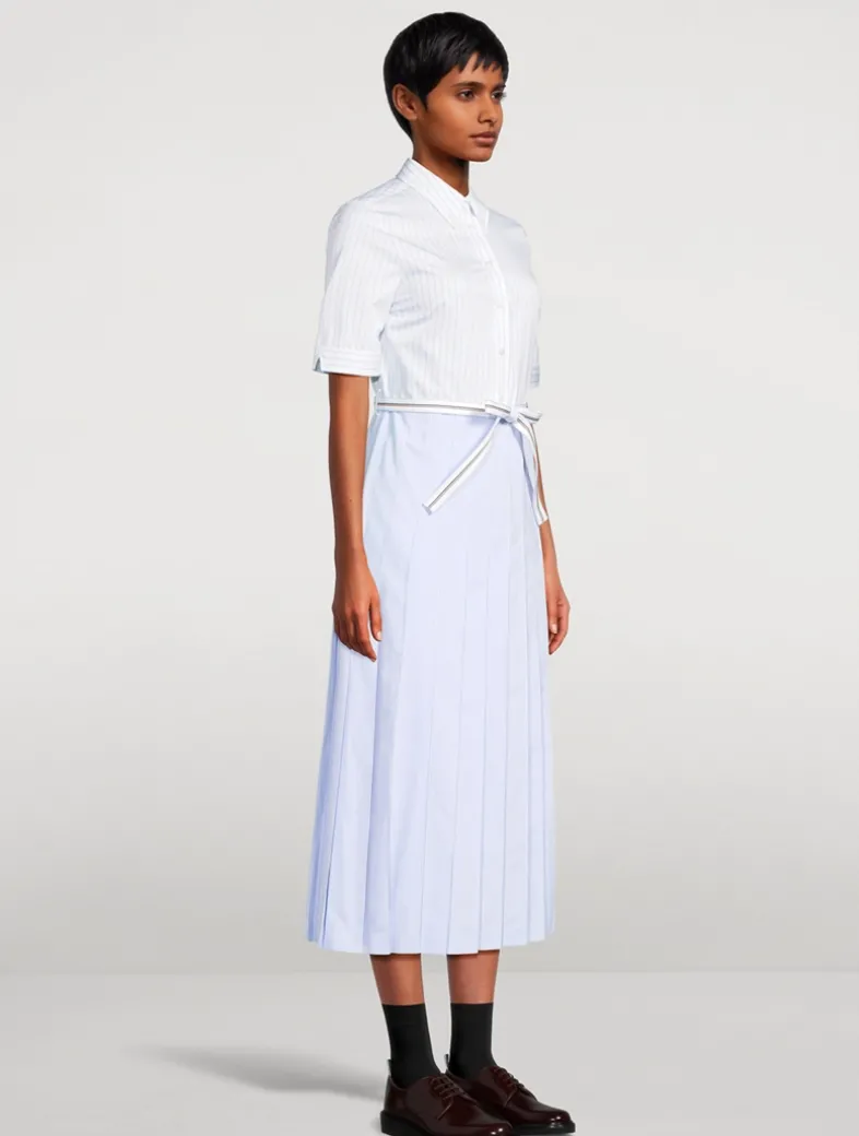 This classic shirt dress pairs a knee-length pleated skirt with a short-sleeve button-down shirt, creating a faux layered look. Crafted from cotton poplin, it is tailored to perfection and finished with a knotted bow belt.