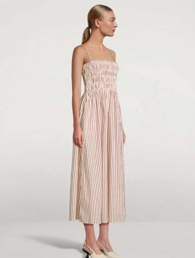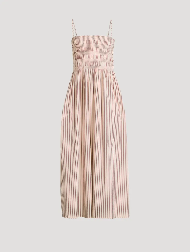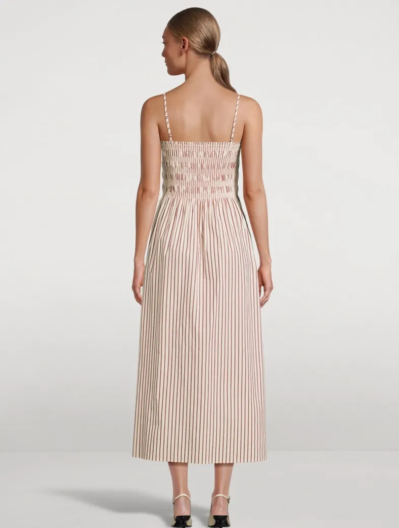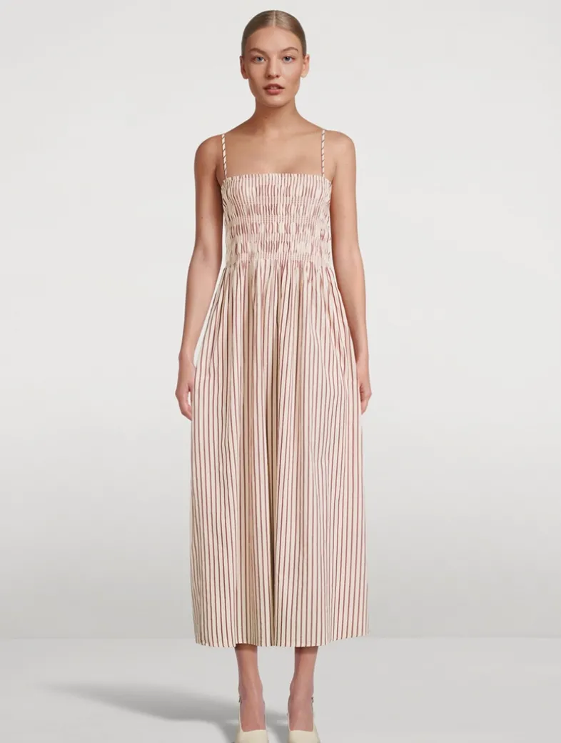 This breezy day dress is crafted from a flowing, lightweight cotton blend printed with stripes. Featuring a smocked bodice with ruched design details, topped with adjustable shoulder straps.