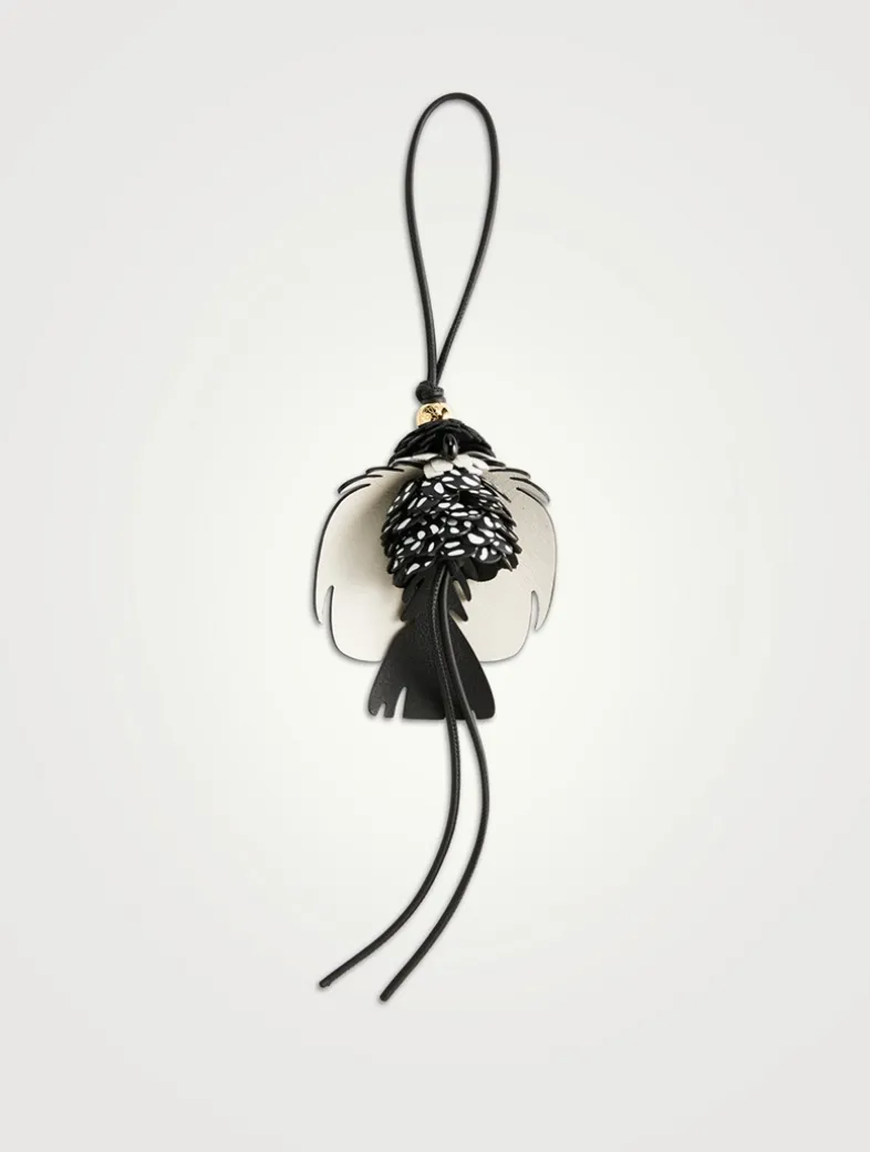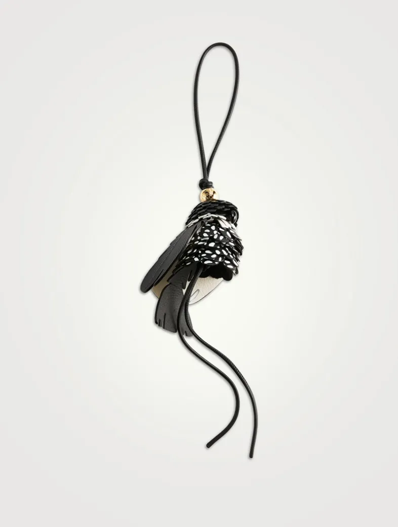 This bird charm in printed classic calfskin designed with a looped calfskin strap and an Anagram Pebble in a gold-tone finish.