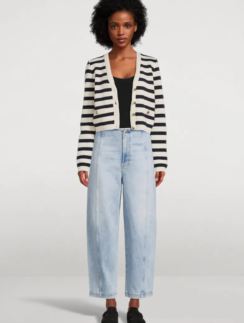 The unique shape of these barrel-leg jeans offers a modern twist, while the absence of a waistband creates a smooth, streamlined silhouette that feels inherently sophisticated. Notice the chic seaming details and ankle-length inseam.