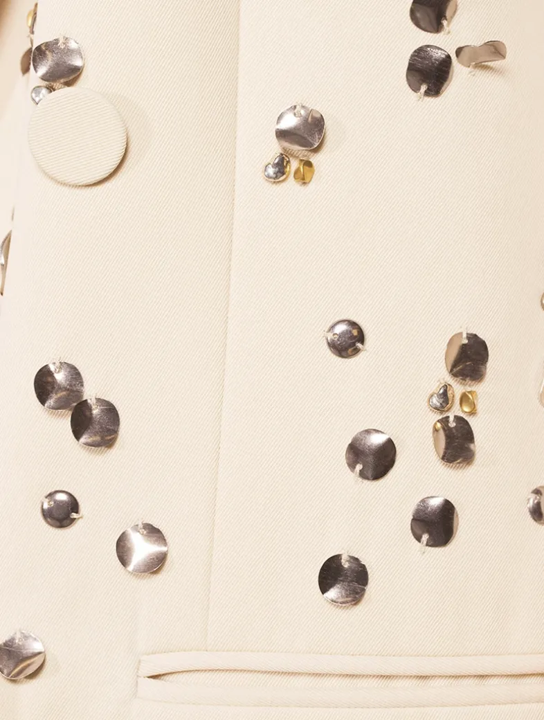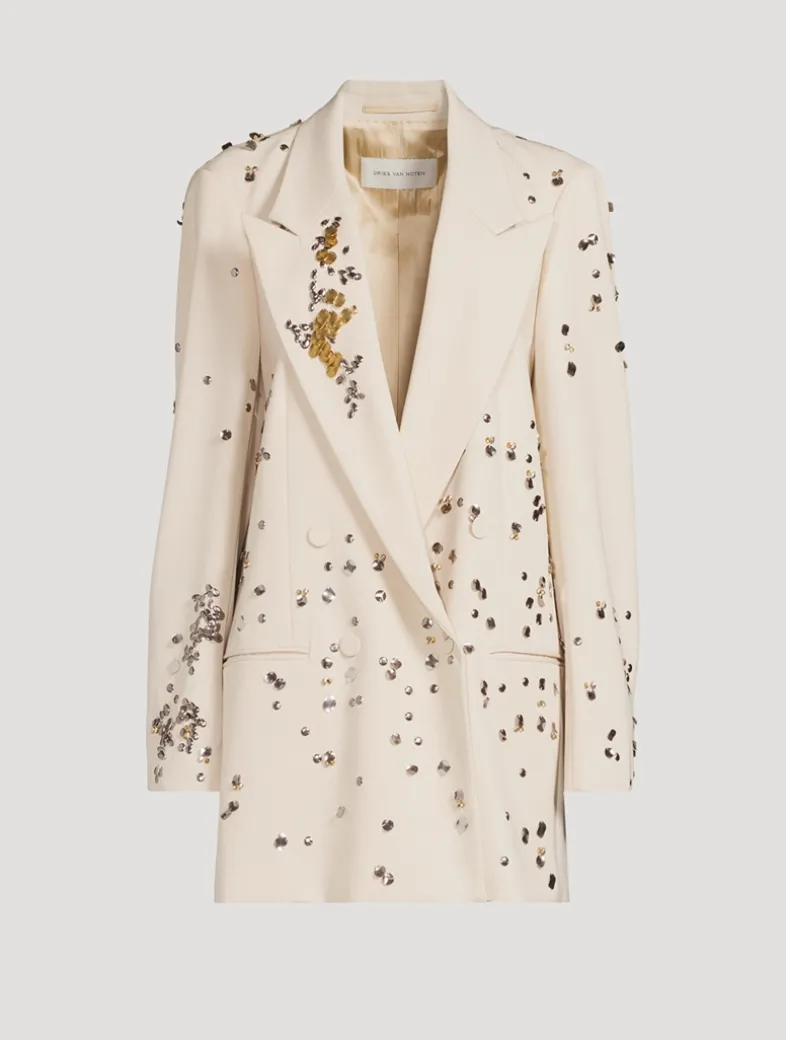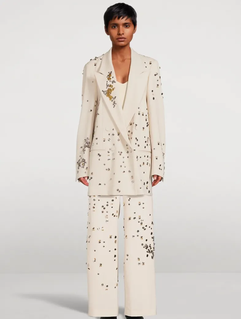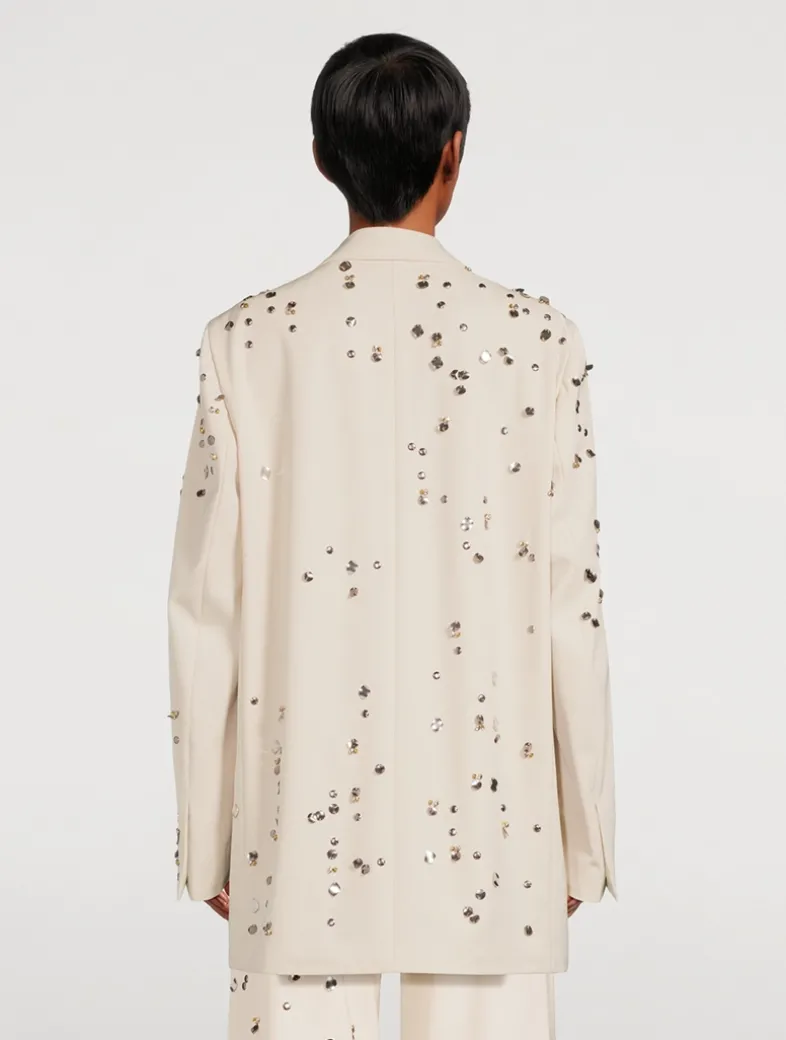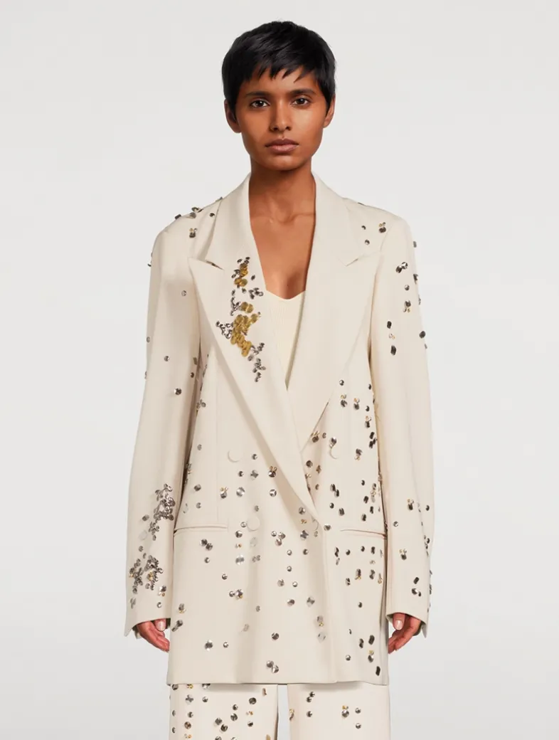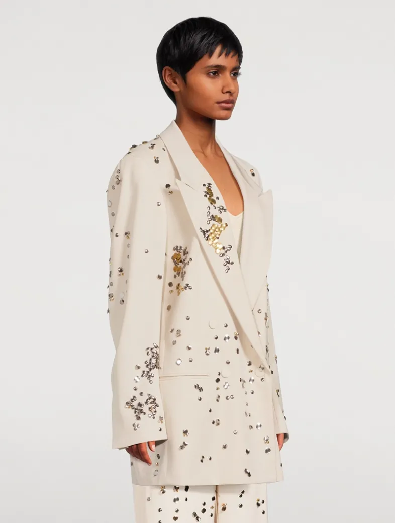 Cut in an oversized silhouette, this double-breasted blazer mixes a borrowed-from-the-boys charm with elegant styling. The wool jacket is embroidered with beaded embellishment and highlighted with covered buttons at the placket.