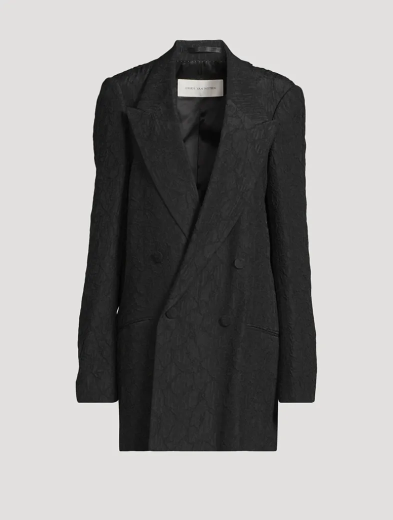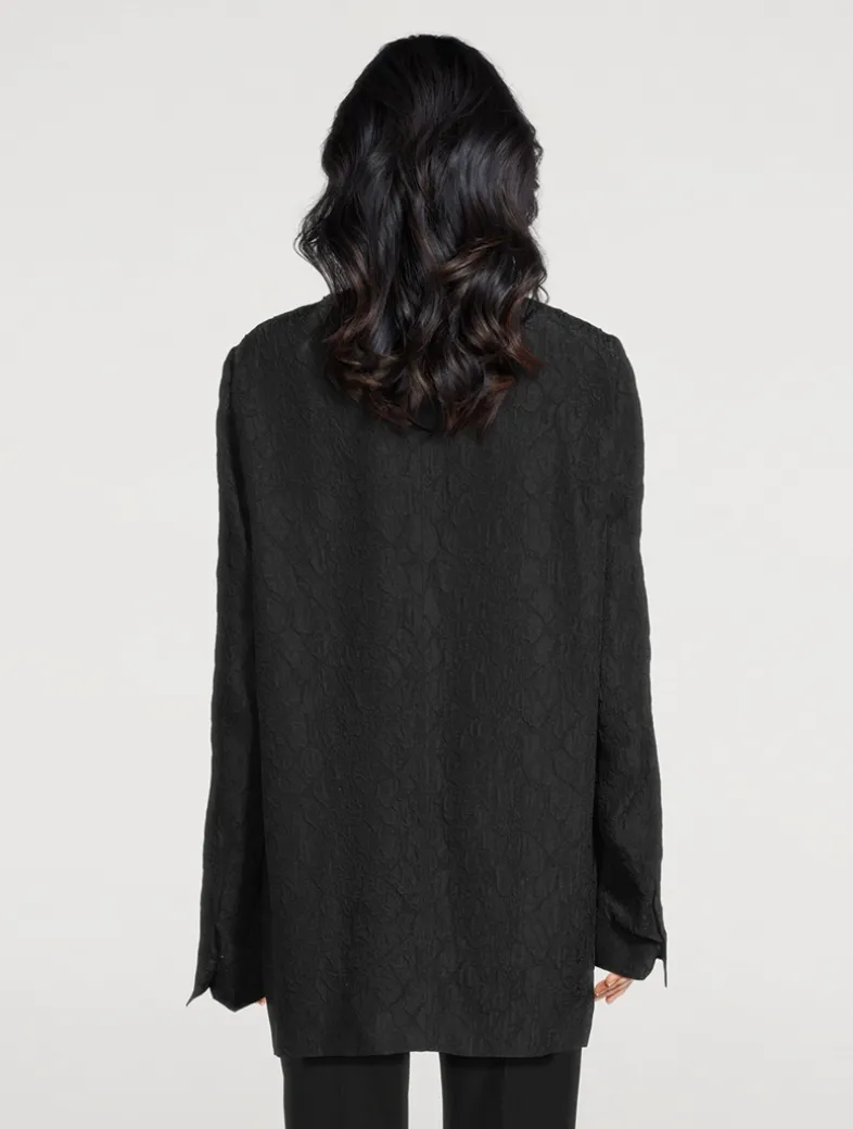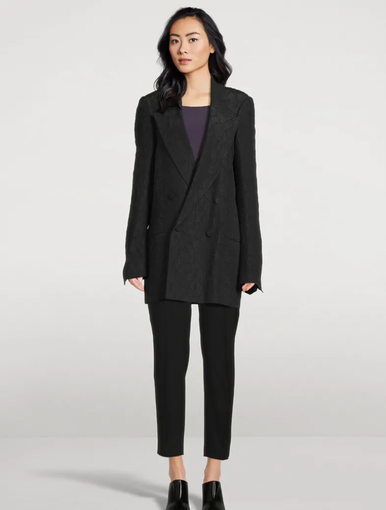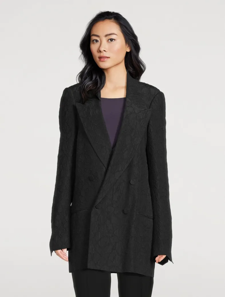 Cut to an oversized silhouette, this double-breasted blazer mixes a borrowed-from-the-boys charm with elegant styling. The silk-blend jacket has a textured cloqué finish, covered buttons, and welt pockets at the waist.