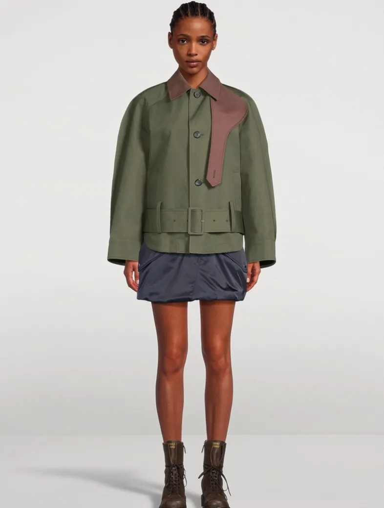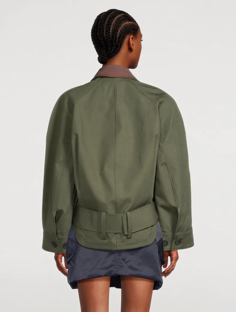 This casual cotton jacket is complete with curved raglan sleeves and a contrasting collar. Cut to a boxy fit, it has a wide buckled belt, side pockets, and a quilted lining.